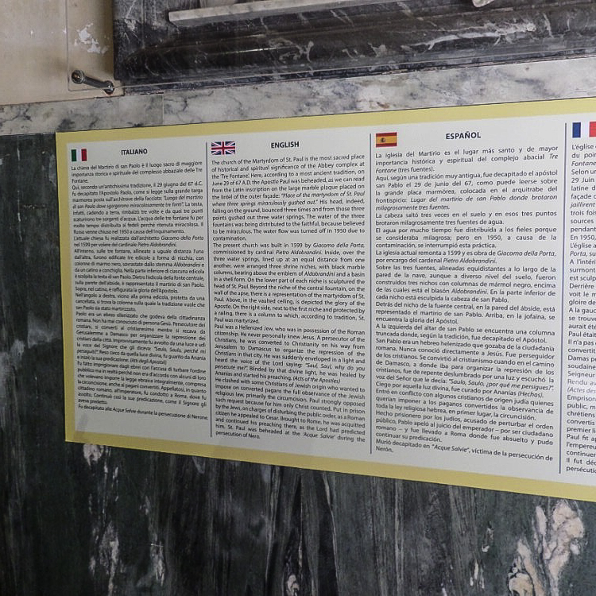 Signage in Italian, English, Spanish, and French is shown at the entrance to the Church of St. Paul at the Three Fountains. Four miles outside the city of Rome, Italy is the Abbey of the Three Fountains, run by Cisterian monks belonging to the Trappist order. The complex contains three churches, of which Church of Saint Paul at the Three Fountains (Church of the Martyrdom of Saint Paul; San Paolo alle Tre Fontane; Church of St. Paul the Apostle) is most sacred. This church was built on the site where Saint Paul was beheaded at Emperor Nero's order. As a Roman citizen, Saint Paul could not be executed within the city. The legend is that Paul's head bounced three times and fountains sprang up at each spot; hence, the title of "Three Fountains." Actually, fountains already existed at the site when Paul was beheaded. The signage provides an important overview of the church's history for tourists.