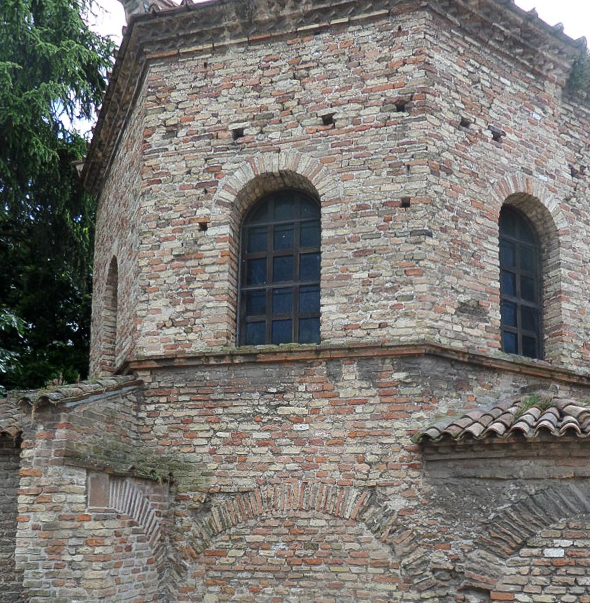View of the octagonally-shaped Battistero degli Ariani (or Arian Baptistery; Arian Baptistry), a brick UNESCO World Heritage Monument built by the Ostrogothic king Theodoric at the end of the 5th century AD. The church served the Arian Christian community and was originally part of the Arian cathedral, which is now known as the Church of the Holy Spirit. The exterior of the baptistery reveals a subsidence of 2.25 meters. The lower register features apses, while the upper register contains arched windows.