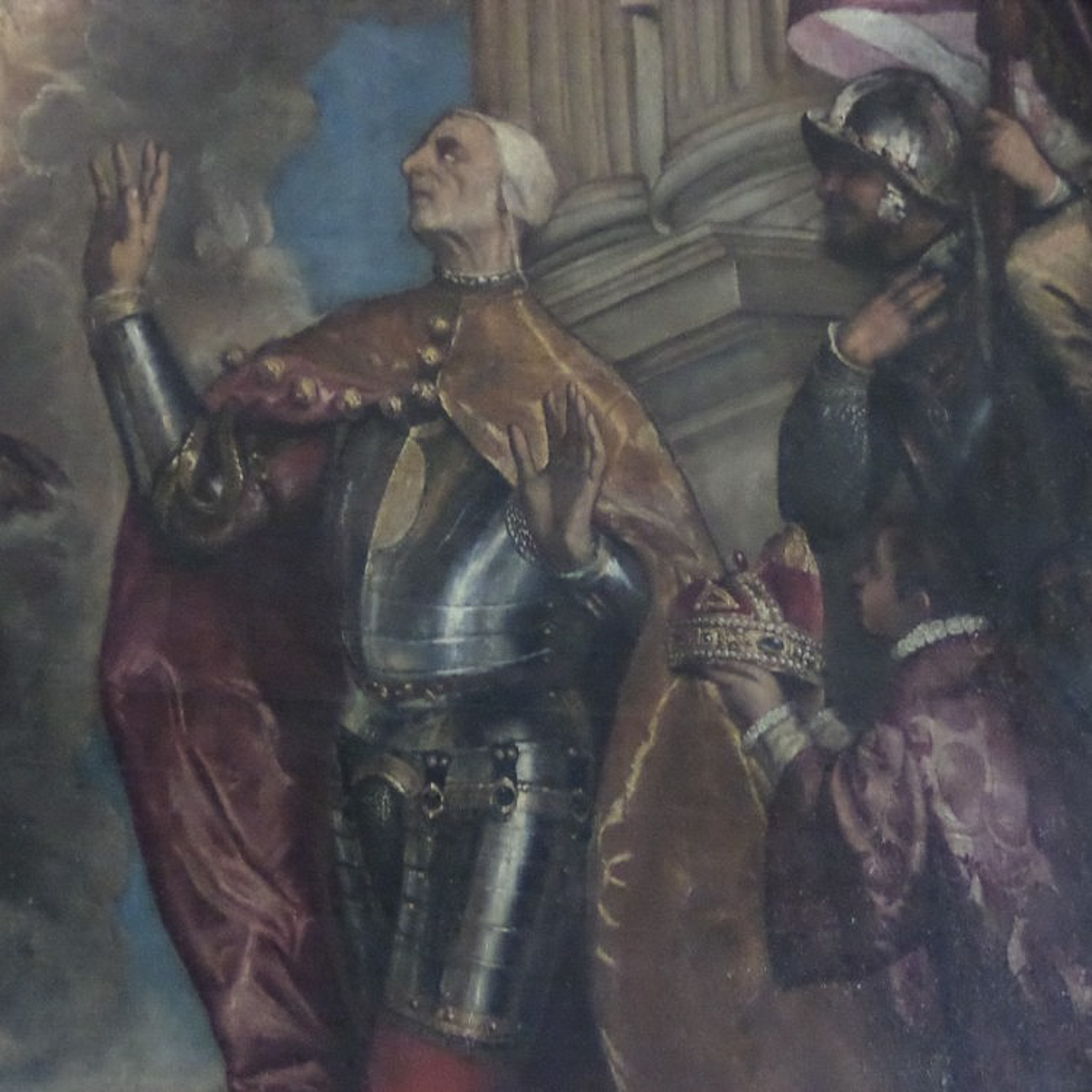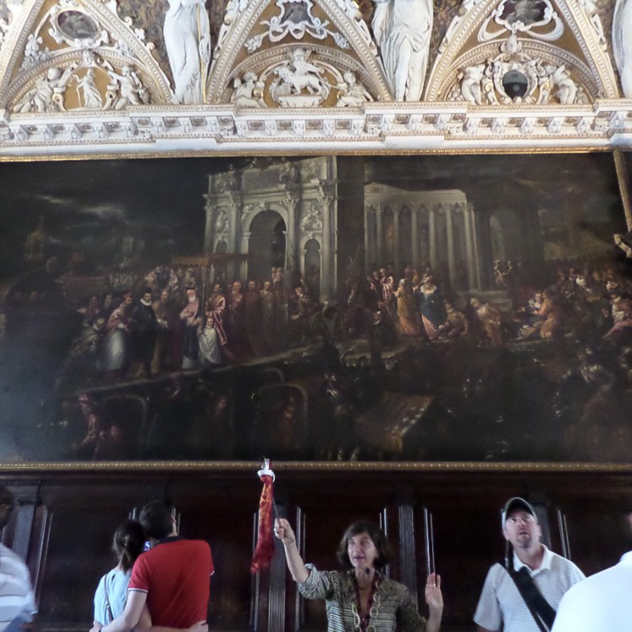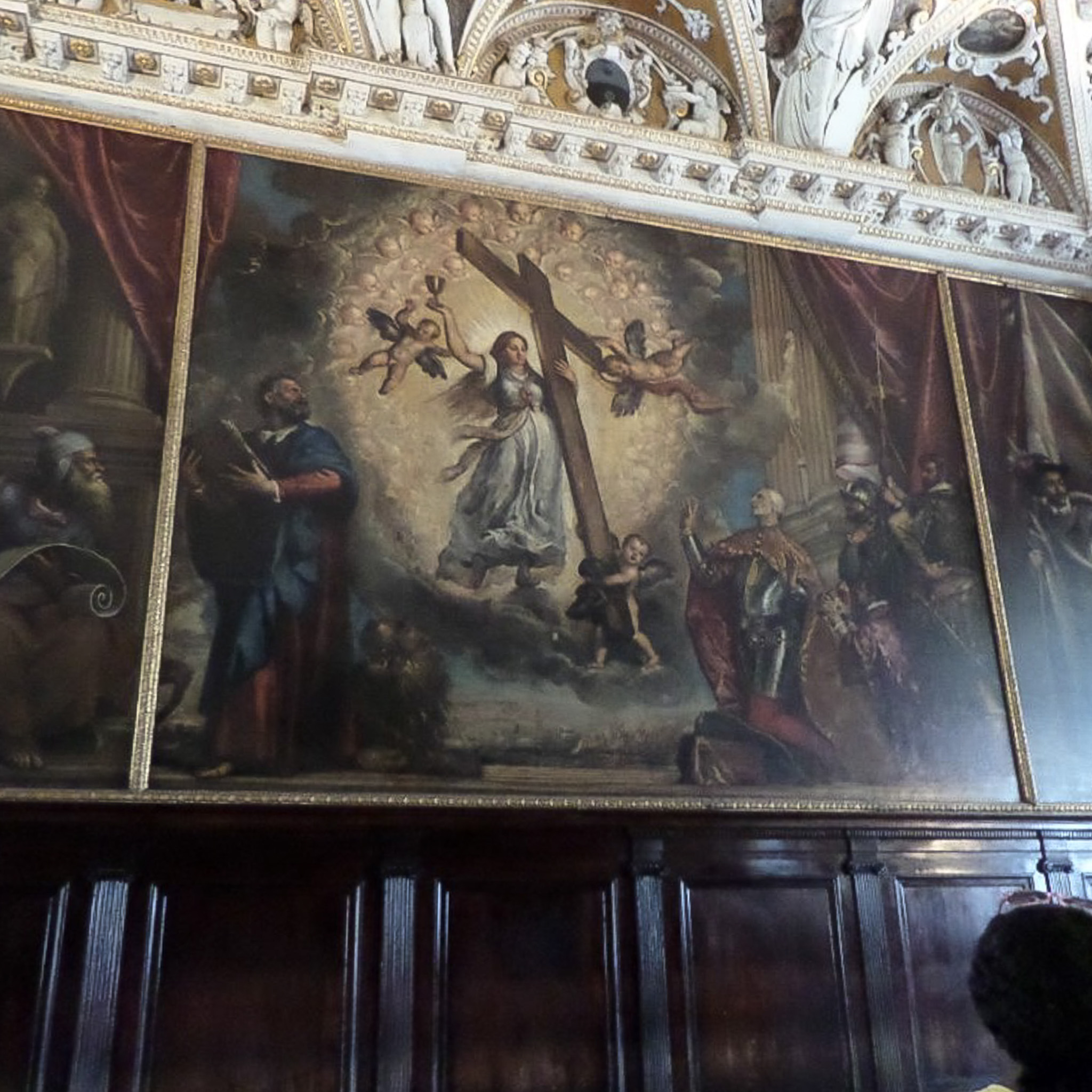 Multiple photos are associated with this record. Please click the links to view all of the items in the series. The photos show some wall paintings in the Hall of the Four Doors (in Italian: Sala delle Quattro Porte) of the Doge's Palace (Palazzo Ducale), which is located in the San Marco district on the island of Venice, Italy. Venice (Venezia) is a city in northeastern Italy that is built on a group of 126 islands separated by open water and canals, linked through 472 bridges. The historical island city is home to only 51K people, but a very popular tourist destination with about 60K tourists per day. A UNESCO World Heritage Site, it is renowned for its beauty, architecture, and artwork. The Doge (chief magistrate) of Venice was the supreme authority of the Republic of Venice when this palace was built in 1340. The Hall of the Four Doors is the second room upon entering the Doge's Palace (after the Square Atrium). The hall extends the entire width of this wing of the palace. The paintings on the walls that are shown in the photos are "Offering the Symbols of a City to Emperor Augustus" (by an anonymous artist) and "Doge Antonio Grimani Kneeling Before the Faith," by Titian, which is also shown in a detail image. The Grimani painting is also a complex allegory of Venice, with the city visible in the background. St. Mark, patron saint of Venice, is the figure depicted on the left foreground. Titian died before this painting was completed, so it was probably completed by his workshop.