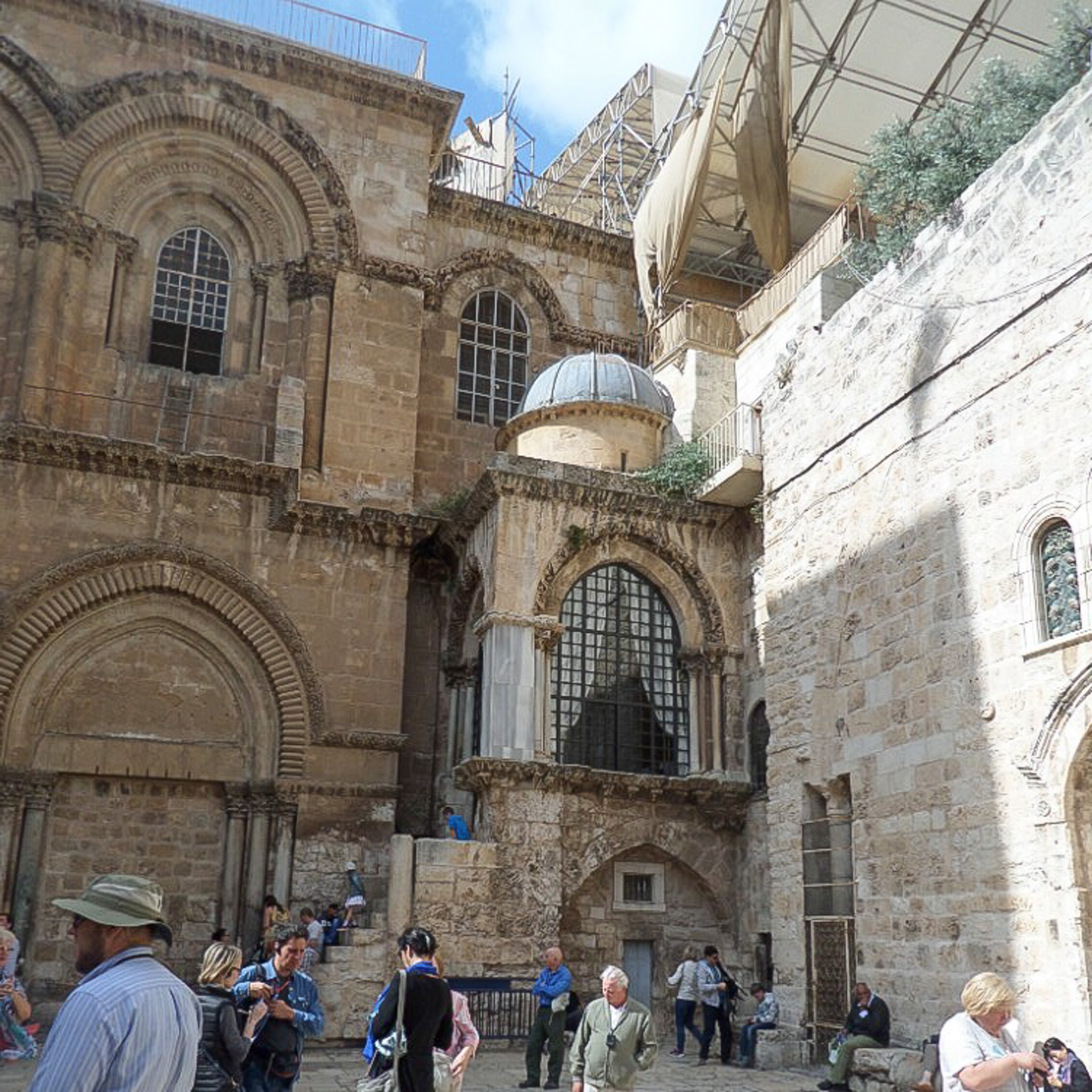 The immovable ladder is visible under the second window. The domed structure is the small chapel dedicated to St. Mary of Egypt. It is sometimes called the Chapel of the Agony of the Virgin or the Chapel of the Sorrows.