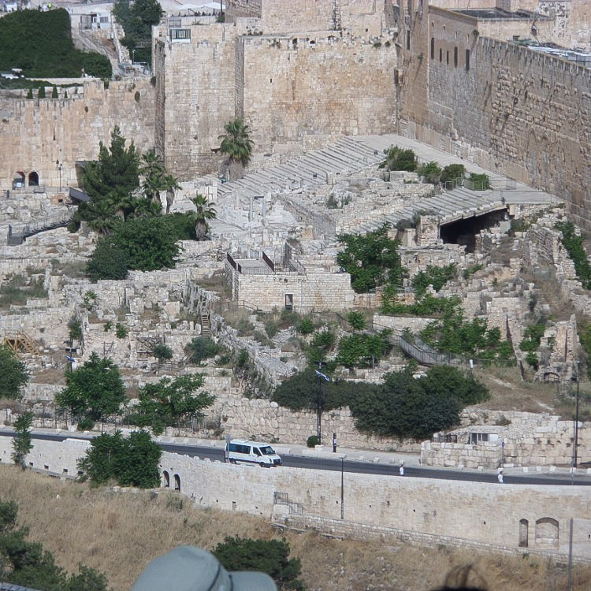 A view, taken from across the Kidron Valley, of the southern wall and southern steps by which 1st Century adherents to Judaism would have entered the Temple Mount during festivals.