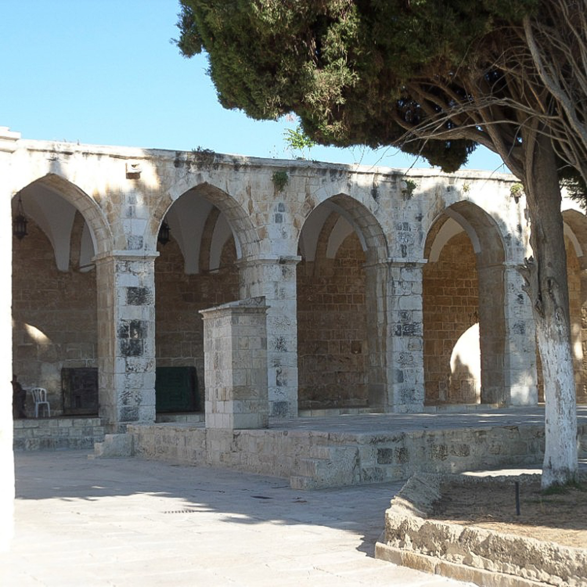 This is an image taken outside the al-Aqsa Mosque located in Temple Mount.. The platform has a Mihrab, or niche, indicating the direction of prayer. It allows the platform to be used as an outdoor mosque where there are large crowds.