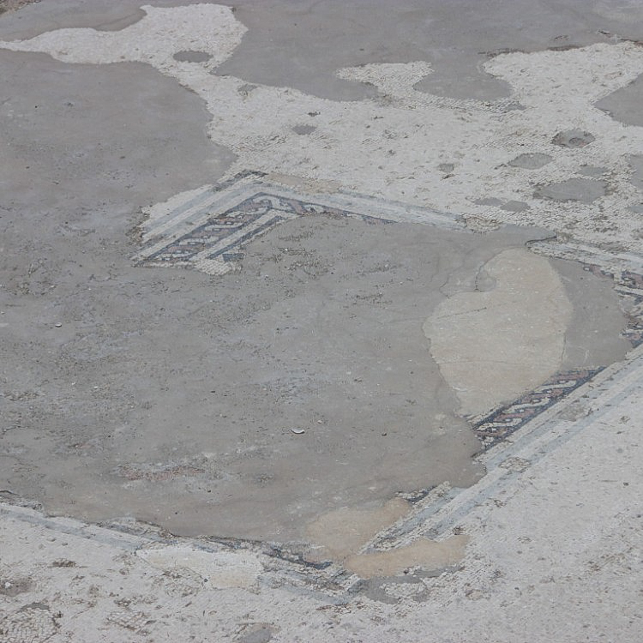 A geometric mosaic is part of the lower palace floor. It is made of individual square tiles (tesserae).