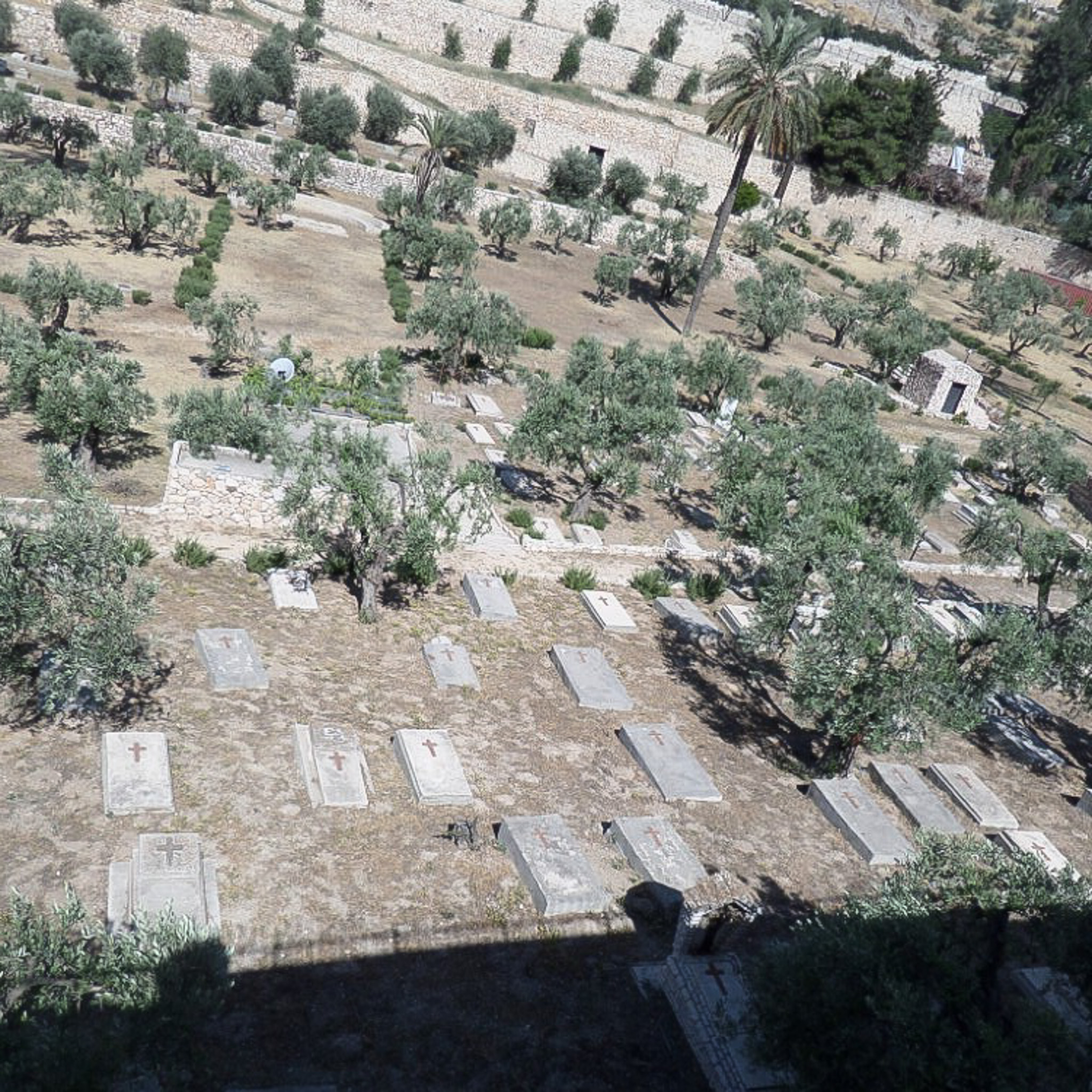 Olive trees and burial plots marked with crosses are a feature of the Kidron Valley between the Church of All Nations and the Golden Gate.
