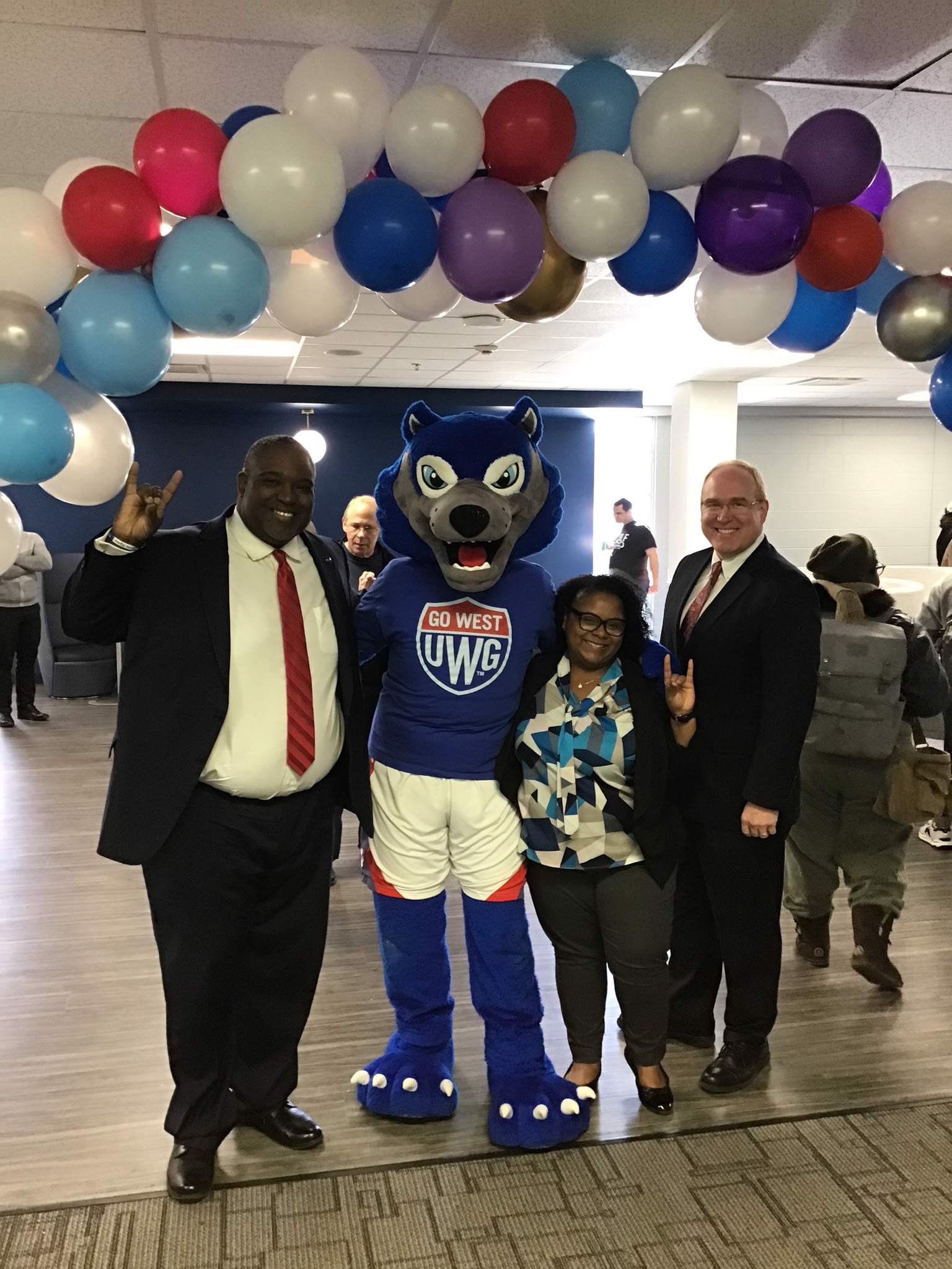 This archival file of information is about Irvine Sullivan Ingram Library (commonly shortened to Ingram Library) at the University of West Georgia in Carrollton, Georgia. This photograph was taken at a reception to celebrate the reopening of the third floor of the Library in March 2024 after a renovation that created more study space for students. The photo shows Vice President for Student Affairs Andre Fortune, Wolfie, Interim Dean of Libraries CJ Ivory, and Provost and Vice President for Academic Affairs Jon Preston. The faculty member in the background between the administrator and Wolfie is Robert Schaefer. The mascot for UWG is the Wolves and making a hand gesture that simulates a wolf face is common, as shown in the photograph.