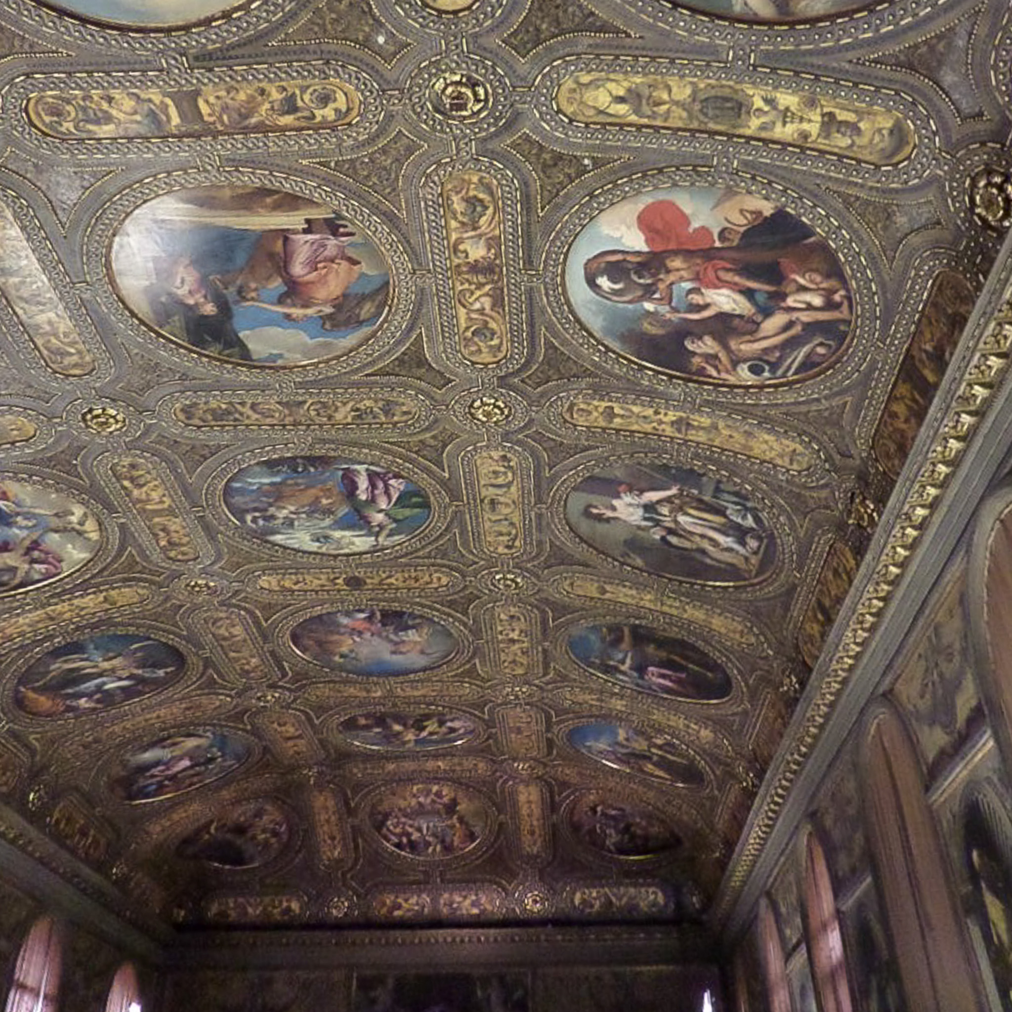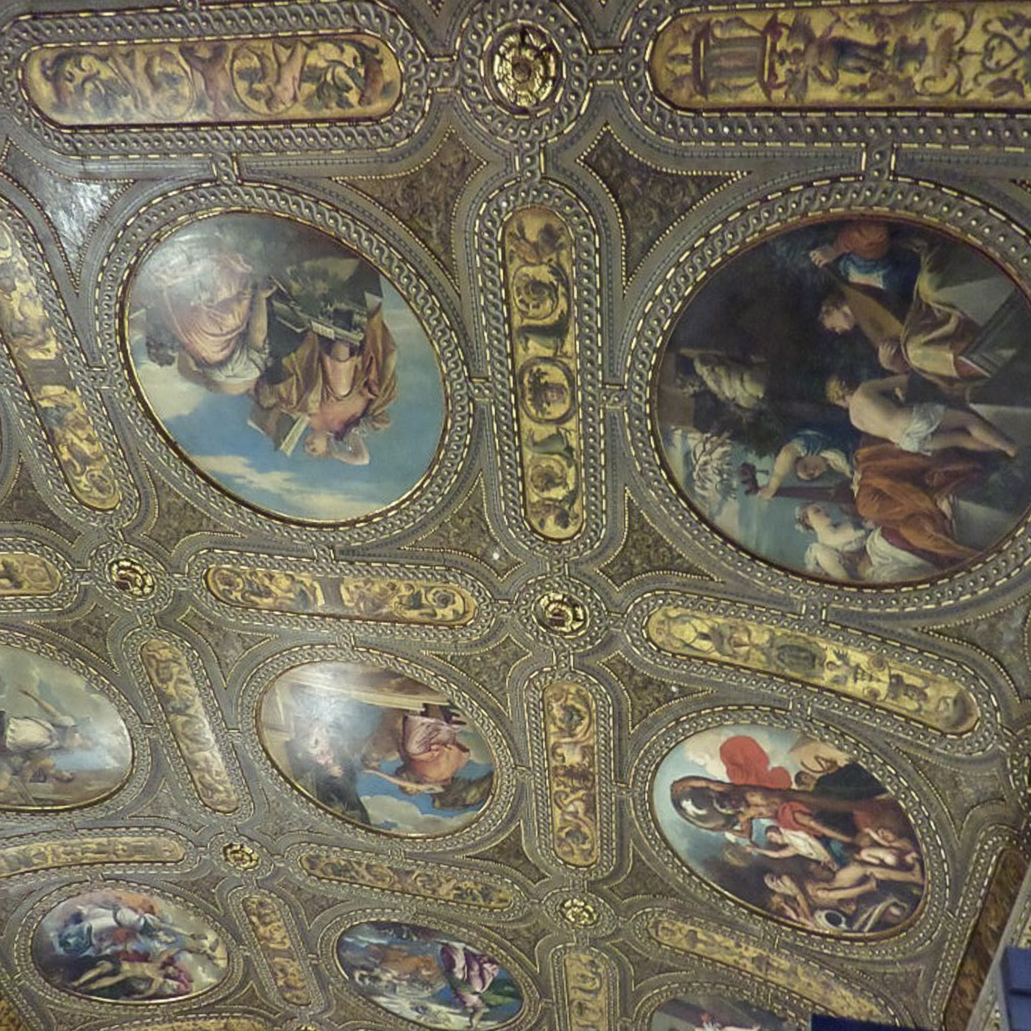 Multiple photos are associated with this record. Please click the links to view all of the items in the series. The photos show the library's ceiling in the Marciana National Library (in Italian: Biblioteca Nazionale Marciana), located in the Small Square of St. Mark's (Piazzetta di San Marco) in the San Marco district on the island of Venice, Italy. Venice (Venezia) is a city in northeastern Italy that is built on a group of 126 islands separated by open water and canals, linked through 472 bridges. The historical island city is home to only 51K people, but a very popular tourist destination with about 60K tourists per day. A UNESCO World Heritage Site, it is renowned for its beauty, architecture, and artwork. The landmark of St. Mark's Square is the basilica dedicated to Saint Mark the Evangelist and contains his relics. The church is sited on the eastern end of the Piazza of San Marco, the former center of the Republic of Venice, and is attached to the Doge's Palace. The Piazzetta di San Marco is a small square that connects the south side of the Piazza di San Marco (Square of St. Mark's) to the waterway of the lagoon. This small square lies between the Doge's Palace on the east and the Biblioteca Marciana on the west. The Marciana Library is part of the Royal Palace of Venice complex, along with the Archaeological Museum and the Correr Museum. The library features a vaulted ceiling with 21 round paintings by Venetian artists such as Titian, Sansovino, and Veronese.