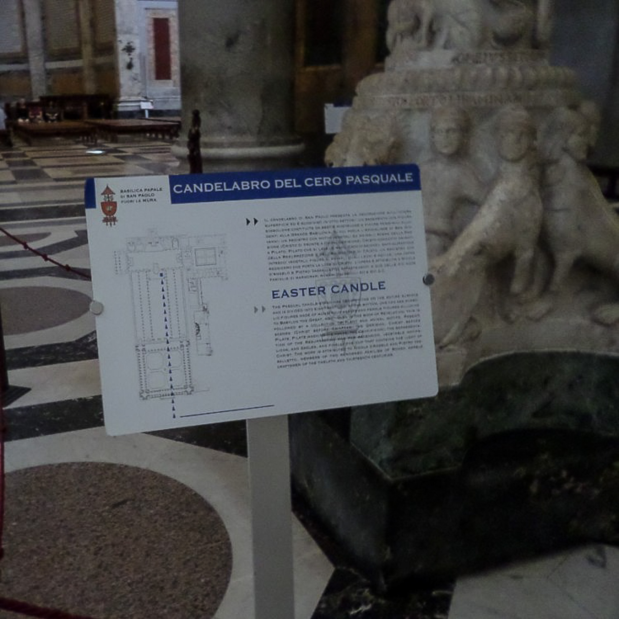 Signage for the Candelabrum of the Easter Candle inside the Papal Basilica of Saint Paul Outside the Walls (Rome, Italy). According to https://www.vatican.va/various/basiliche/san_paolo/en/basilica/oro_basilica.htm: "The Candelabrum of the Easter Candle has been present since the 10th century, near the bare altar during the Holy Saturday liturgy. The Candelabrum of Saint Paul is an exceptional example of the work done by the Roman marble artists between the end of the 12th century and the beginning of the 13th: scenes of the Passion and Resurrection are flanked by decorations with acanthus leaves and animals. One can observe the names of Nicola d�Angelo and Pietro Vassaletto to whom this work is attributed."