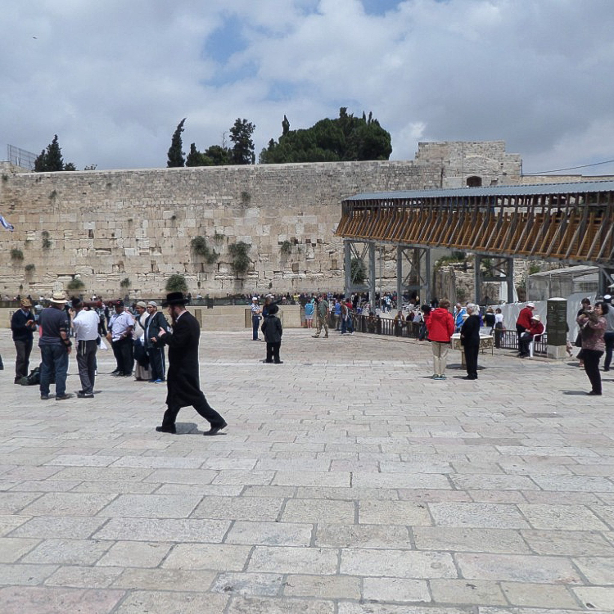 View of the Western Wall and the covered walkway leading to the Temple Mount.
