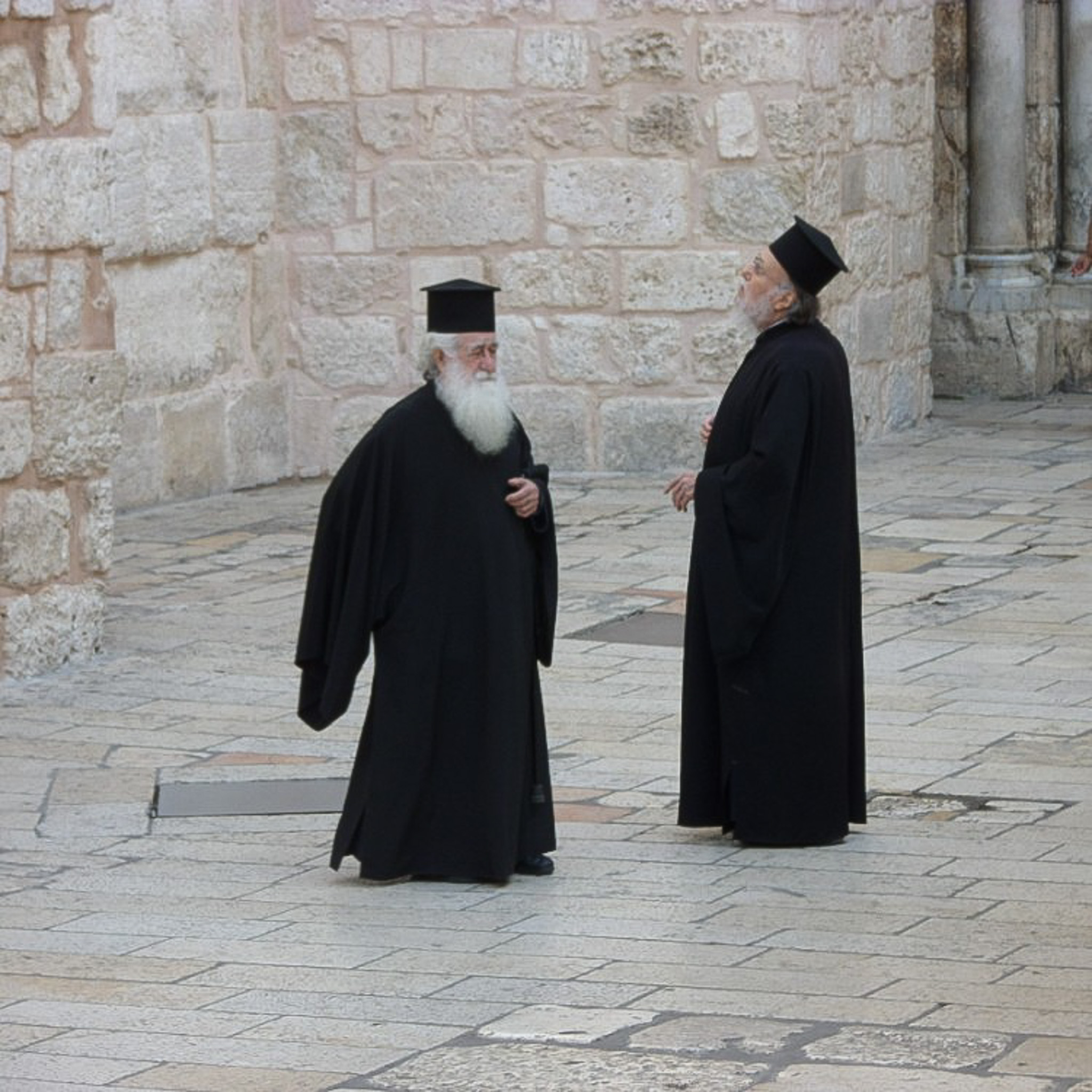 Clergy visiting near the main entrance of the Church of the Holy Sepulchre.
