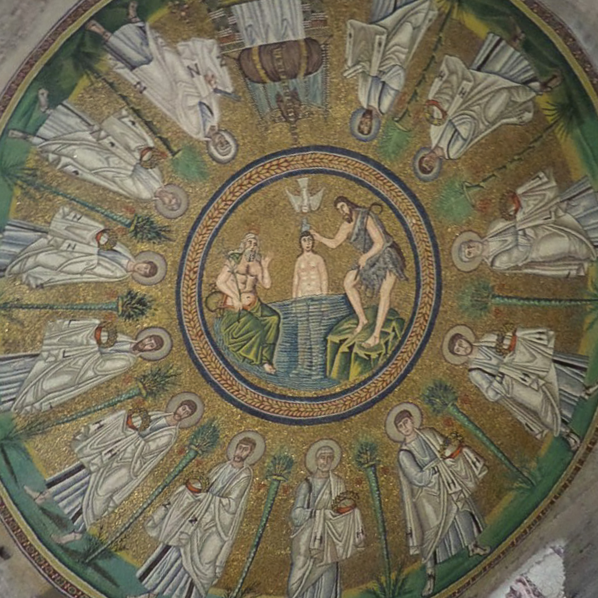 Interior view directly below the domed ceiling of the Battistero degli Ariani (Arian Baptistery; Arian Baptistry). The mosaic decoration features John the Baptist as he baptizes Christ in the Jordan River; the Holy Spirit appears as a dove and the River Jordan as an old man with red horns, wearing a long green loincloth. The outermost mosaic register showcases the empty throne of the Ethymasia, symbolizing the second coming of Christ. It includes a jeweled cross resting on a purple cushion and a representation of the twelve apostles.