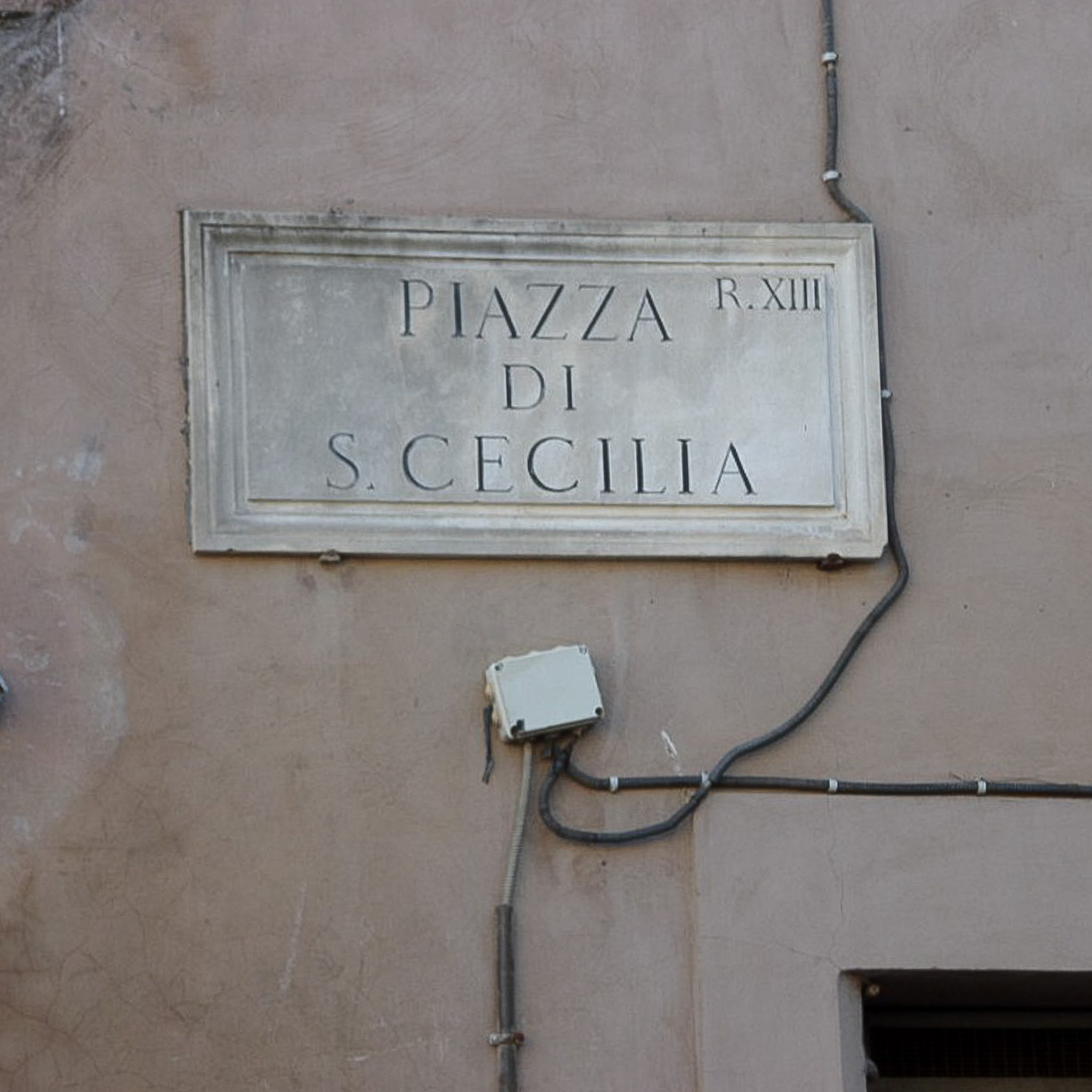 Located in Piazza di Santa Cecilia, the Basilica of Saint Cecilia in Trastevere (Basilica di Santa Cecilia in Trastevere) was built on the site of the house of a Roman martyr and her husband Valeriano. Saint Cecilia was found guilty of trying to convert her husband and brother to Christianity and was martyred in 230 CE. She survived three days in a hot, steamy calidarium without suffocating, so a swordsman tried to behead her. He struck her three times, unsuccessfully, then dropped the sword in fear and ran away. She died three days later from her wounds. Saint Gregory the Great started construction of the basilica in the 6th century. Saint Cecilia's body was discovered intact in 820 in the catacombs of San Callisto after, legend says, a saint revealed its location to Pope Paschal I in a dream, and he ordered it to be transferred to the renovated church. In the 12th and 13th centuries the cloister, atrium, and bell tower were added to the basilica. Saint Cecilia's body was exhumed in 1599 during another renovation and was found still intact, wrapped in her white garment, with dried blood on her neck. A statue of this body, posed exactly how she was found, was sculpted by Stefano Maderno in 1600 and appears under the current altar, with her actual relics stored below. Today the basilica is under the care of the Benedictine nuns who live in the attached monastery. The site hosts one of the best archaeological sites in Rome. The photograph shows signage for the Piazza di Santa Cecilia, which has an entrance gate to the basilica. One goes through this building into a courtyard with a central cantharus (large Roman vase). The facade of the basilica was constructed by Ferdinando Fuga in the 18th century from ancient pink granite columns and African marble.