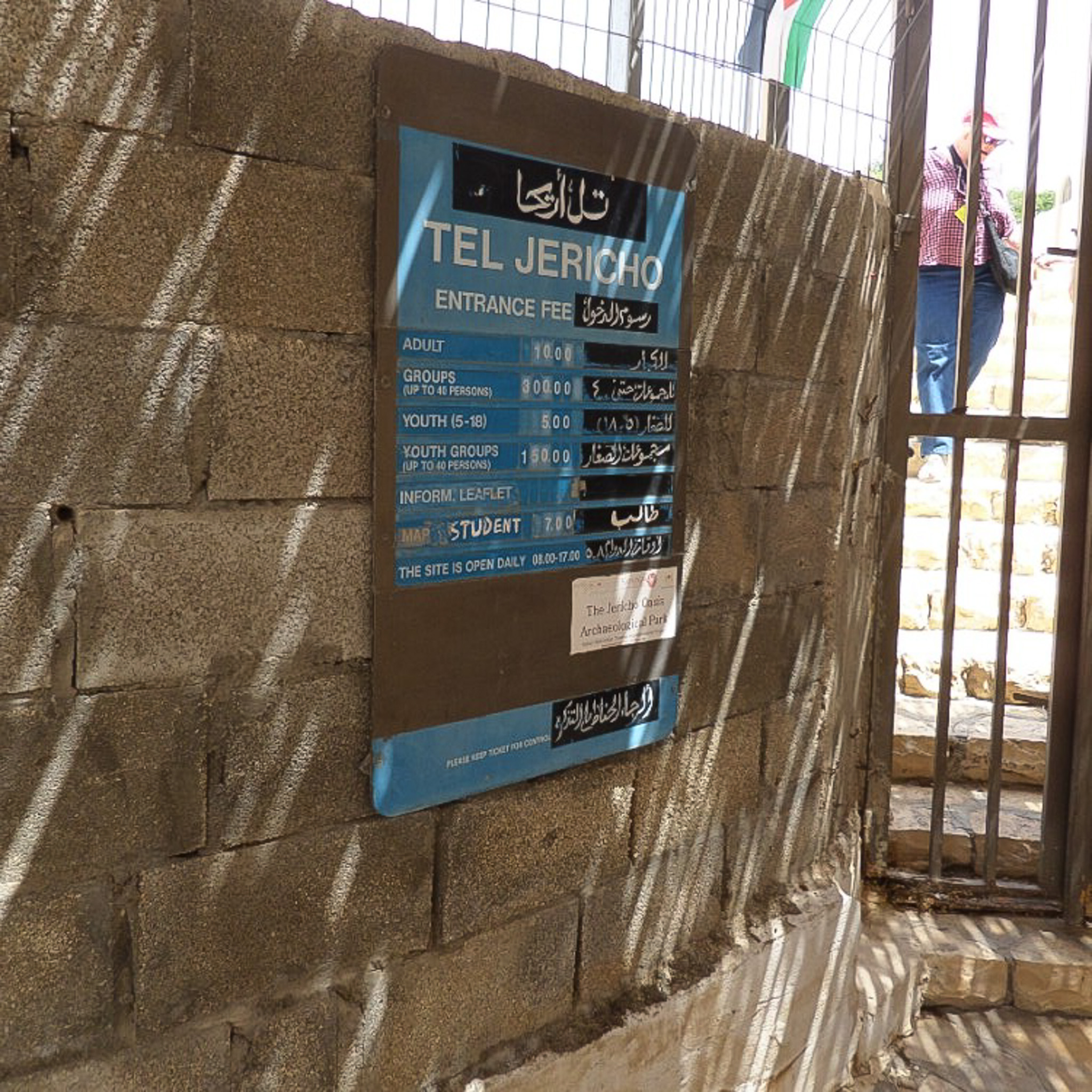 A sign at the entrance details fees and hours. The sign is in English and Arabic with no Hebrew. At the time of this tour in 2023, Jewish guides and bus drivers tended to refer tour groups to Palestinian (or Arab) guides and drivers for tours related to sites in the West Bank.