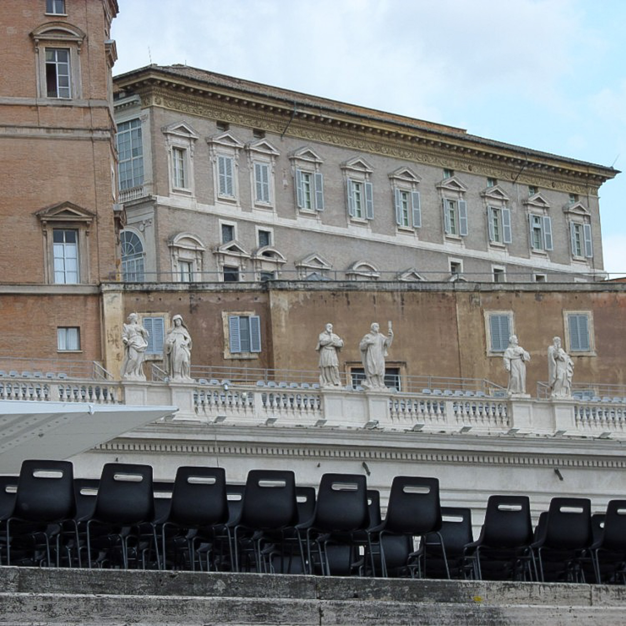 St. Peter's Basilica was originally designed by architect Bramante as a central plan at the behest of Julius II to be the largest, most magnificent church in Christendom when it was rebuilt in the early 16th century. Raphael and Michelangelo and later architects such as Maderno and Bernini designed and decorated the elongated nave to create a basilica which would hold large numbers of people and focus attention on the altar; therefore, it incorporates both Italian High Renaissance and Baroque sensibilities. It was begun in 1506 and completed in 1626. According to the Catholic Church, the very holy basilica is the burial site of Saint Peter. The photo shows a small part of St. Peter's Square with Colonnades, which is a large plaza directly in front of the basilica. It was designed by Gian Lorenzo Bernini from 1656 to 1672. The colossal Doric colonnades, four columns deep, provide a framework for the trapezoidal entrance to the basilica (part of the top shown in the photo) and the massive elliptical plaza in front of it. Statues of 140 saints top the colonnades.
