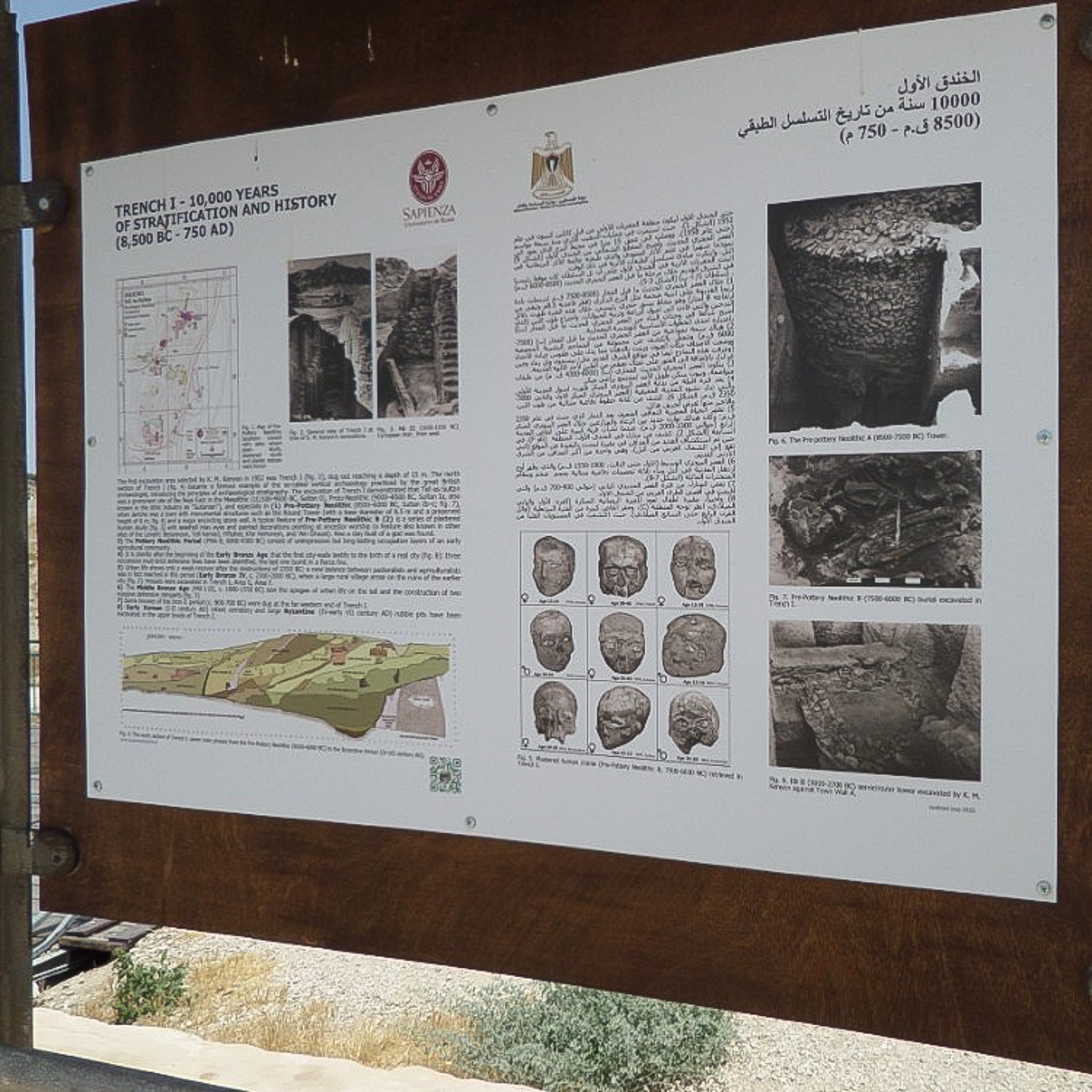 A sign describing the various strata in Trench 1, which was part of the dig by Kathleen Kenyon. The trench revealed strata from 8,500 BC to 750 AD (pre-pottery neolithic to the Byzantine era).