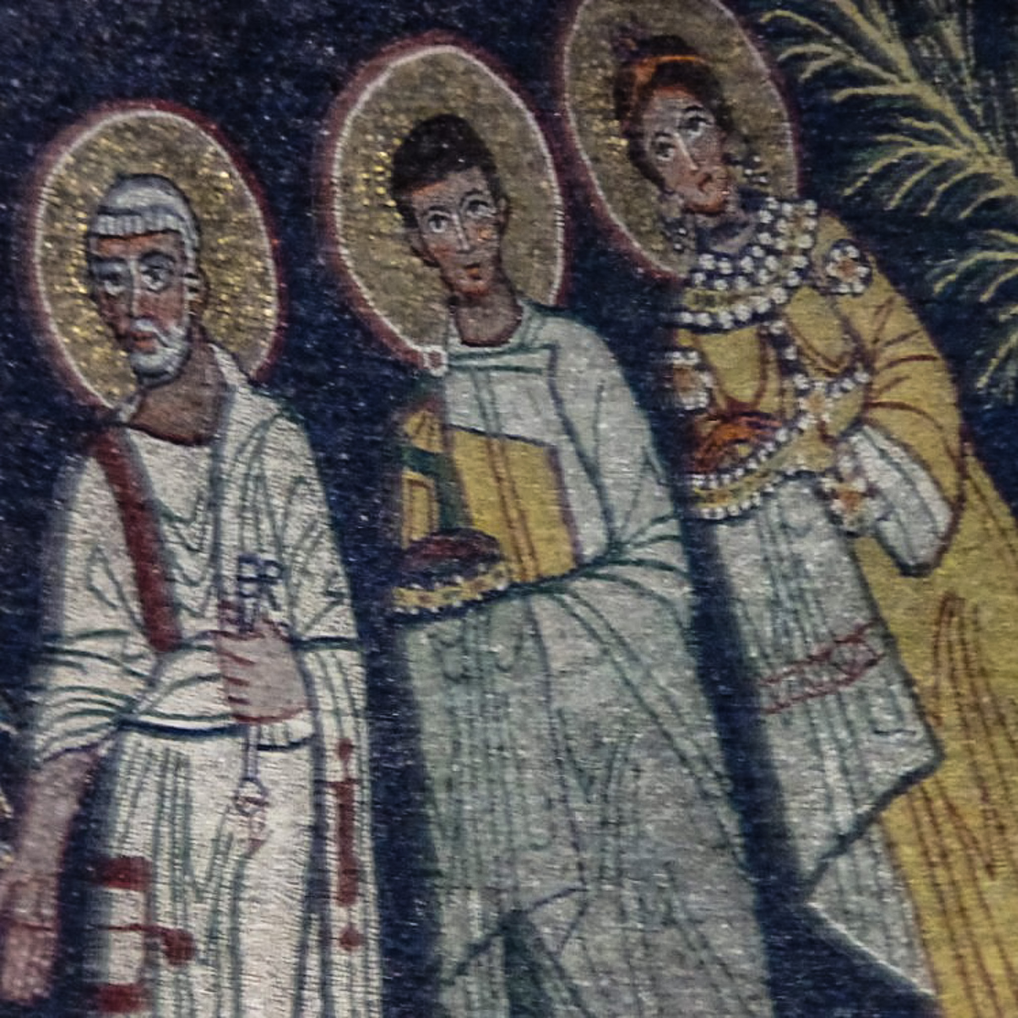 Located in Piazza di Santa Cecilia, the Basilica of Saint Cecilia in Trastevere (Basilica di Santa Cecilia in Trastevere) was built on the site of the house of a Roman martyr and her husband Valerian. Saint Cecilia was found guilty of trying to convert her husband and brother to Christianity and was martyred in 230 CE. She survived three days in a hot, steamy calidarium without suffocating, so a swordsman tried to behead her. He struck her three times, unsuccessfully, then dropped the sword in fear and ran away. She died three days later from her wounds. Saint Gregory the Great started construction of the basilica in the 6th century. Saint Cecilia's body was discovered intact in 820 in the catacombs of San Callisto after, legend says, a saint revealed its location to Pope Paschal I in a dream, and he ordered it to be transferred to the renovated church. In the 12th and 13th centuries the cloister, atrium, and bell tower were added to the basilica. Saint Cecilia's body was exhumed in 1599 during another renovation and was found still intact, wrapped in her white garment, with dried blood on her neck. A statue of this body, posed exactly how she was found, was sculpted by Stefano Maderno in 1600 and appears under the current altar, with her actual relics stored below. Today the basilica is under the care of the Benedictine nuns who live in the attached monastery. The site hosts one of the best archaeological sites in Rome. The photograph shows detail of the apse mosaic of figures to the right of Christ, which are depictions of St. Peter, St. Valerian, and St. Agatha.