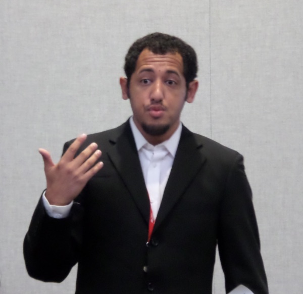 Jacob Rivera, wearing a black suit and white dress shirt, answers questions from the audience at the 2024 Humanities Undergraduate Research Conference held at the University of West Georgia.