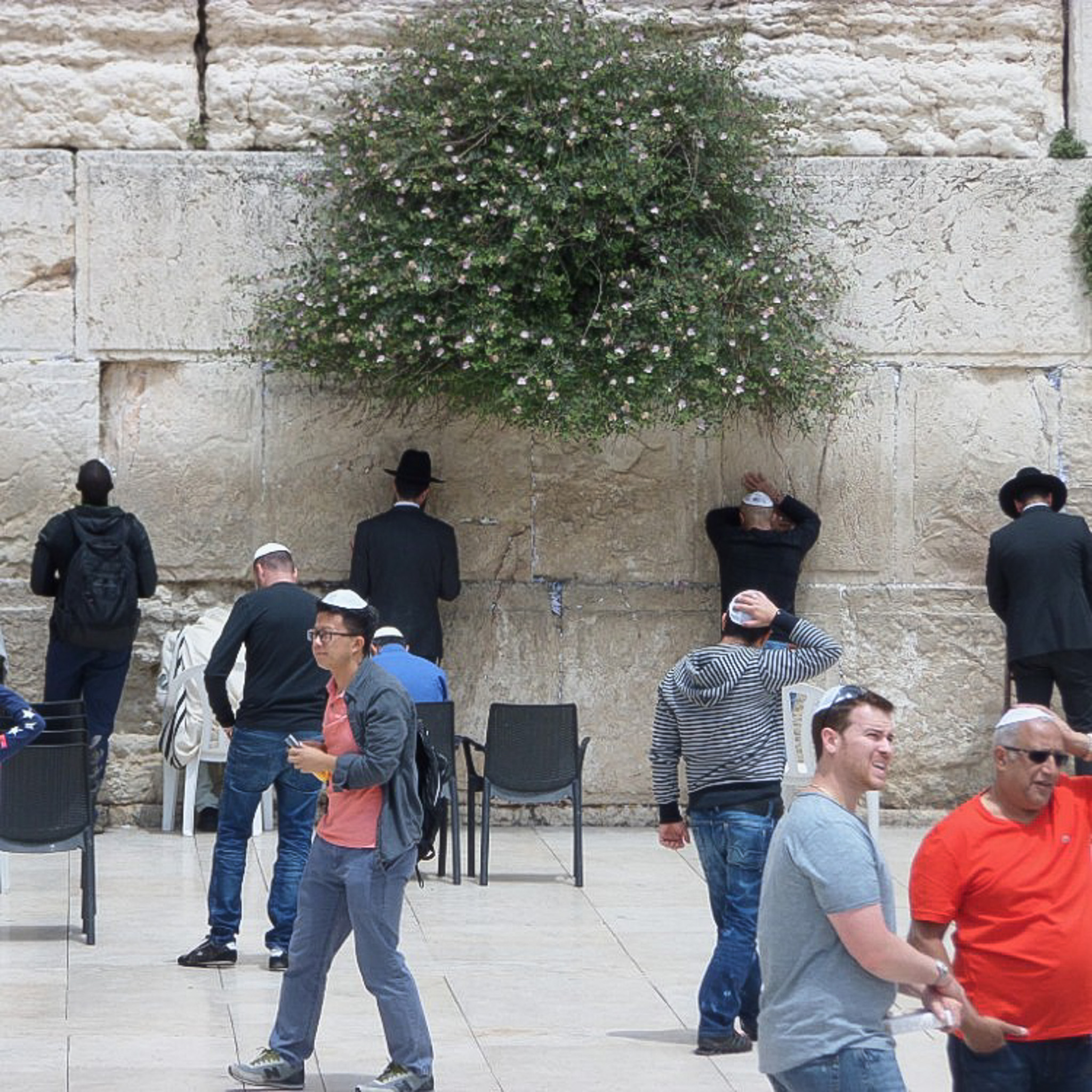 This photo shows the male section of the Western Wall. Featuring several worshipers.