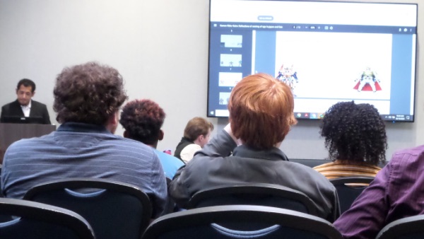 There are multiple photos in this series. Please click each link to open the individual photos. Audience members take in Jacob Rivera's presentation "Kamen Rider Gaim: Reflections on Coming of Age and Fate in Japan" at UWG's 2024 Humanities Undergraduate Research Conference held on October 10, 2024 in the Campus Center Ballroom. Kamen Rider is a Japanese superhero who rides a motorcycle. Rivera's presentation was completed under the direction of faculty supervisors Dr. Charles Lipp (History) and Dr. Laura Miller (English). Rivera is wearing a black suit and white dress shirt.