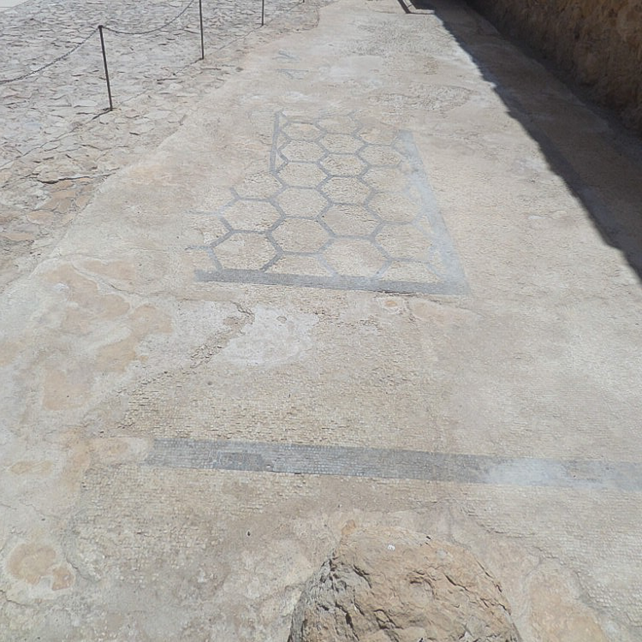 A mosaic floor with black and yellow tesserae forms a pattern of interlocking hexagons. This was (possibly) within the colonnaded courtyard of the bath.