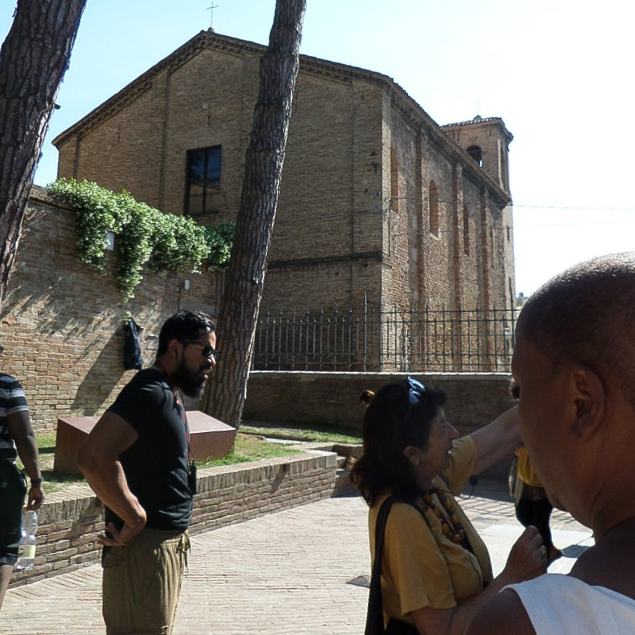 Also on the Via Galla Placidia, northeast of the Mausoleum of Galla Placidia (which is where the woman is pointing), is the deconsecrated Church of Santa Croce (Church of the Holy Spirit) in Ravenna, Italy. The church was built in the 5th century, on the remains of a Roman house, at the behest of the Theodosian Empress Galla Placidia. It features three naves and an extended narthex. Two symmetrical chapels were originally built on the ends of the church, but the only one that remains today is the Mausoleum of Galla Placidia, which was separated from the church building at the beginning of the 17th century. Santa Croce is reputed to have been Galla Placidia's favorite church. She went there at night and prayed on the porphyry (a rare, purple-red stone) floor by candlelight.