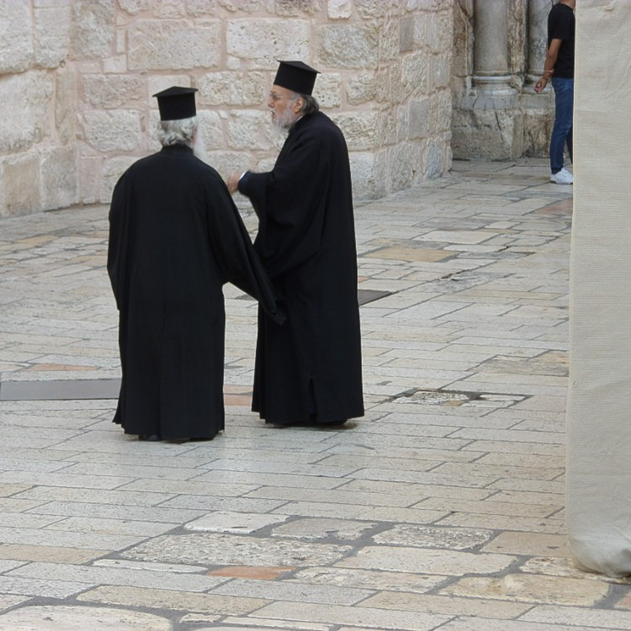 Clergy visiting near the main entrance of the Church of the Holy Sepulchre.