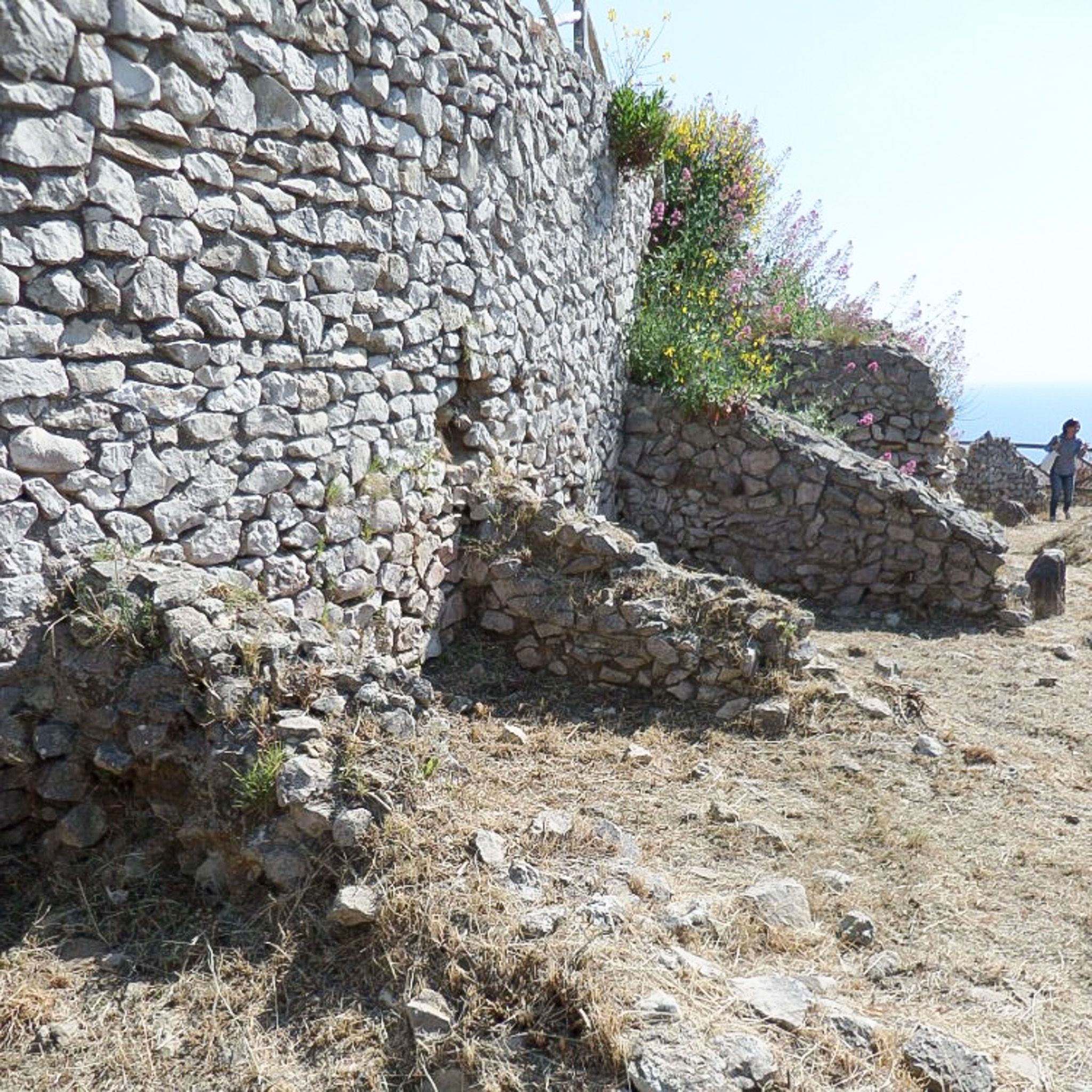 Remains of Villa Damecuta, which is one of twelve Augustan-Tiberian Roman villas on the Island of Capri, Italy. The Roman villa is in ruins today due to the eruption of Vesuvius in 79 A.D. and many raids by pirates. The ruins is located a short walk between the Blue Grotto and the municipality of Anacapri. "Damecuta" is derived from "Domus Cuta" (Dark and Hidden House), as Emperor Tiberius preferred small living spaces similar to caves. Augustus was the first Roman emperor and was succeeded by his stepson, Tiberius.