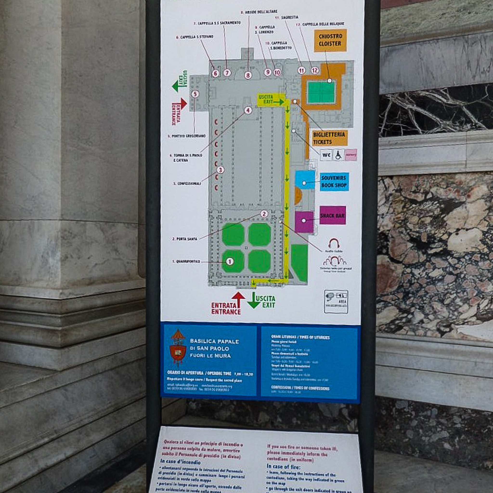 Signage for the Papal Basilica of Saint Paul Outside the Walls (Rome, Italy), featuring a map of the interior.