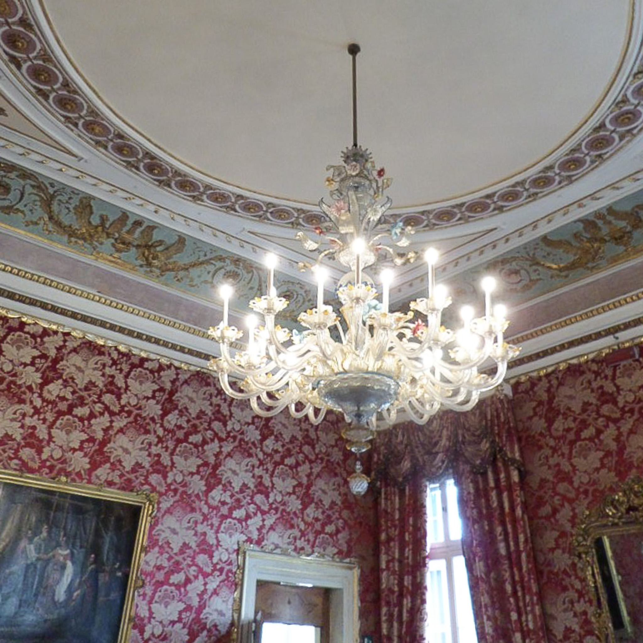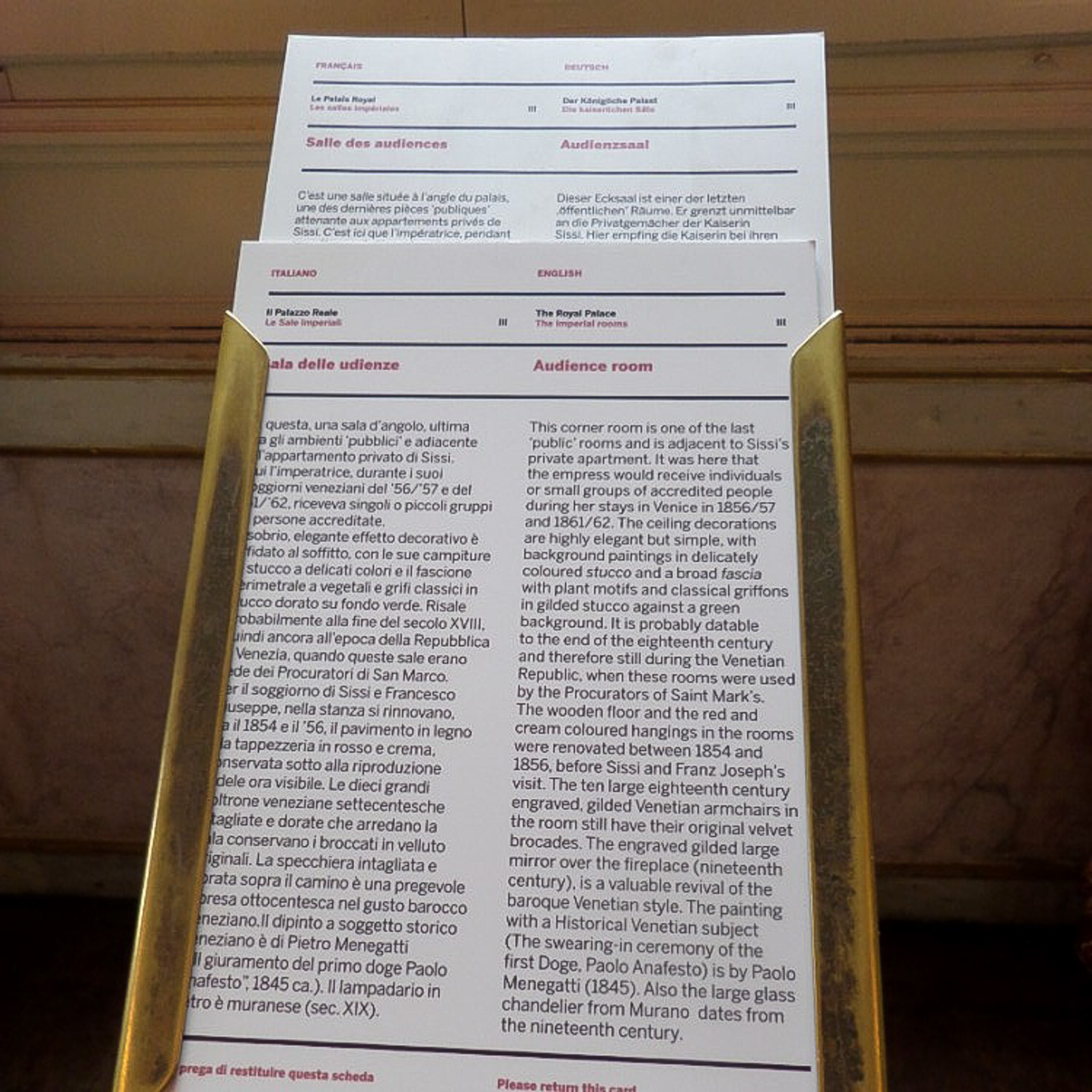 Multiple photos are associated with this record. Please click the links to view all of the items in the series. The photos were taken in the Royal Palace of Venice (in Italian: Il Palazzo Reale) in the San Marco district on the island of Venice, Italy. Venice (Venezia) is a city in northeastern Italy that is built on a group of 126 islands separated by open water and canals, linked through 472 bridges. The historical island city is home to only 51K people, but a very popular tourist destination with about 60K tourists per day. A UNESCO World Heritage Site, it is renowned for its beauty, architecture, and artwork. The landmark of St. Mark's Square (Piazza di San Marco) is the basilica dedicated to Saint Mark the Evangelist and contains his relics. The church is sited on the eastern end of the square, the former center of the Republic of Venice, and is attached to the Doge's Palace. There are other important landmarks around this square, such as the Royal Palace of Venice, which is a complex that consists of the Marciana Library, the Archaeological Museum, and the Correr Museum. These photos are of the Audience Room of Empress Elisabeth and signage in the Correr Museum (Museo Correr), which is located in the Procuratorie Nuove building. The museum's items originated with Teodoro Correr, a passionate collector who bequeathed his collection to the city of Venice in 1830.