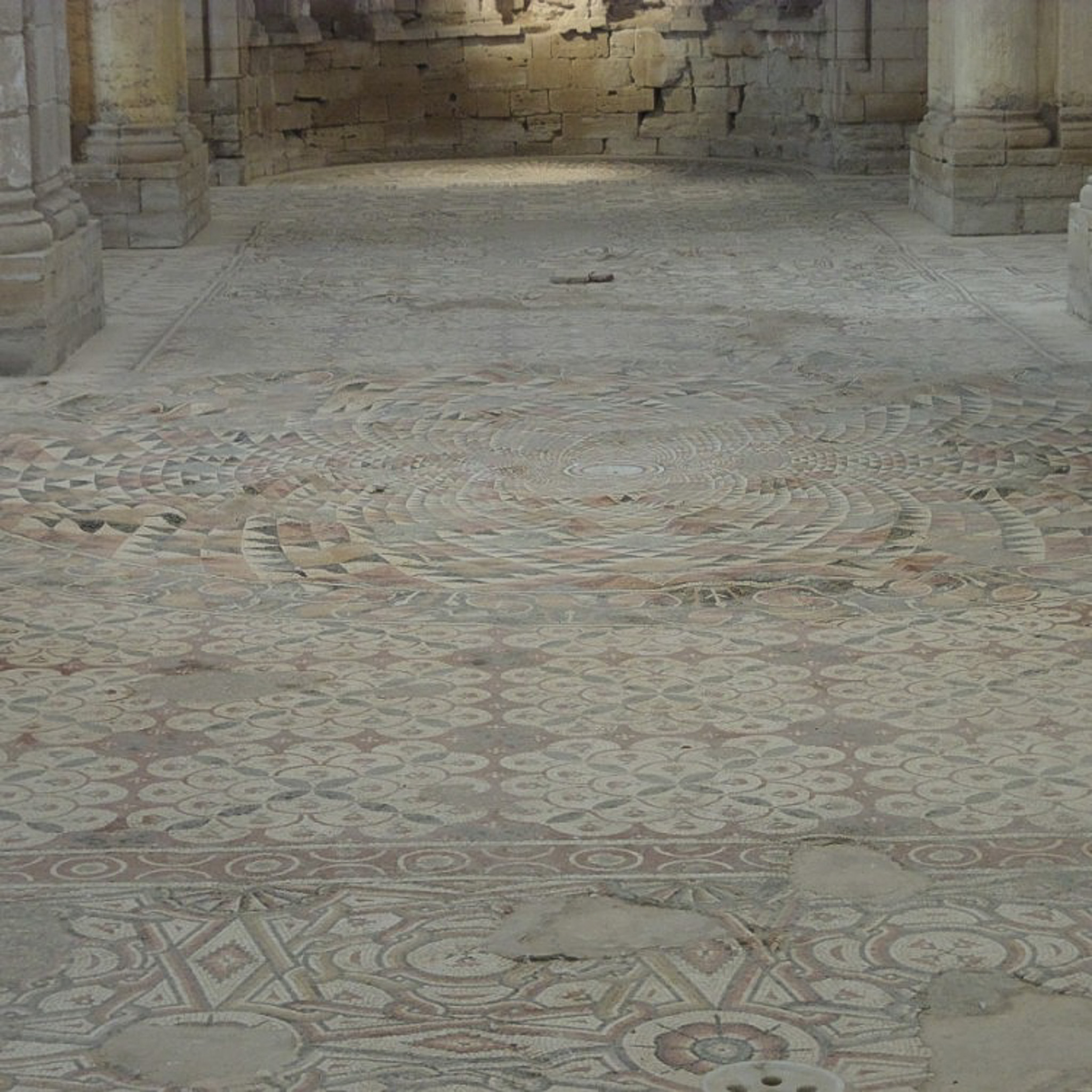 The ceiling was supported by columns. The floor boasts elaborate geometric mosaics which differ slightly in style in each section of the structure.