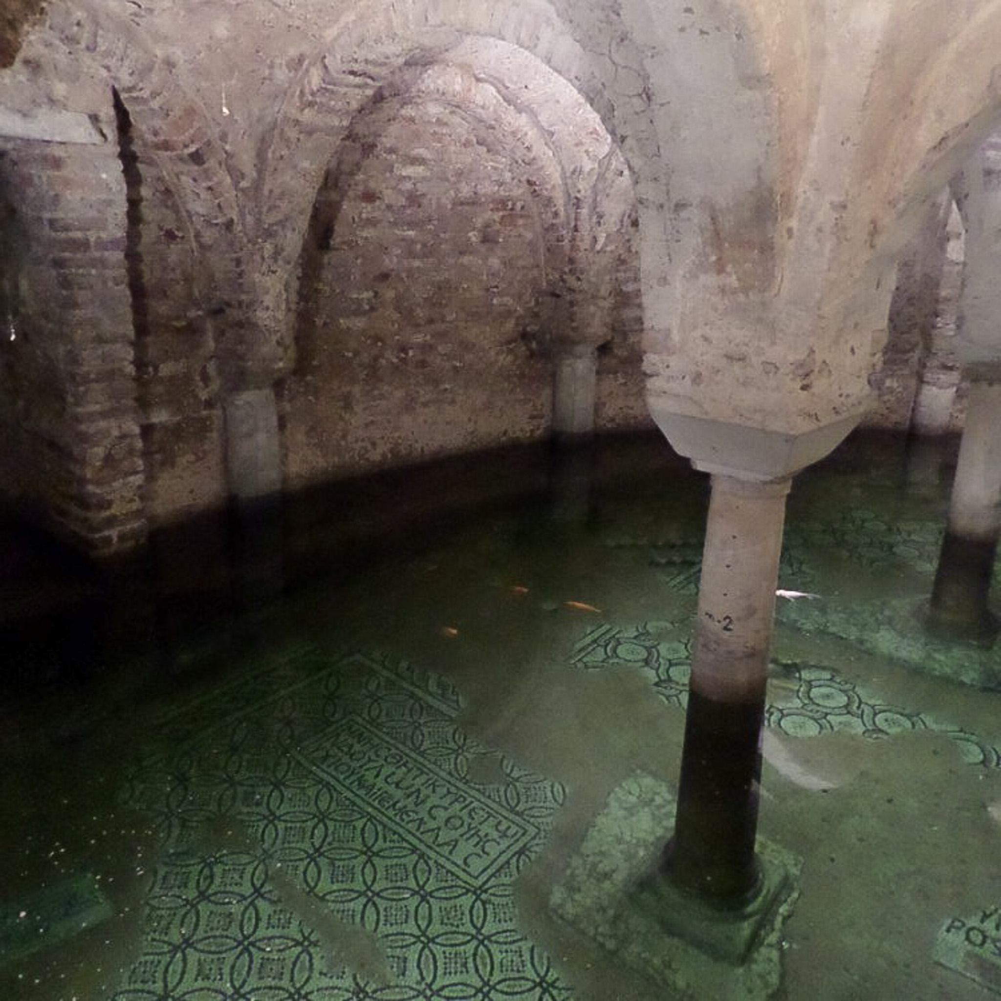 A view of the underground crypt at the church of San Francesco, a major church in Ravenna, Italy. The current building and bell tower were constructed in the 10th century and were rededicated to St. Francis of Assisi in 1261. The church is famous as the site of Dante Alighieri's funeral in 1321. The underground crypt is what remains of the medieval basilica. The marks of past floods are evident in the photo.