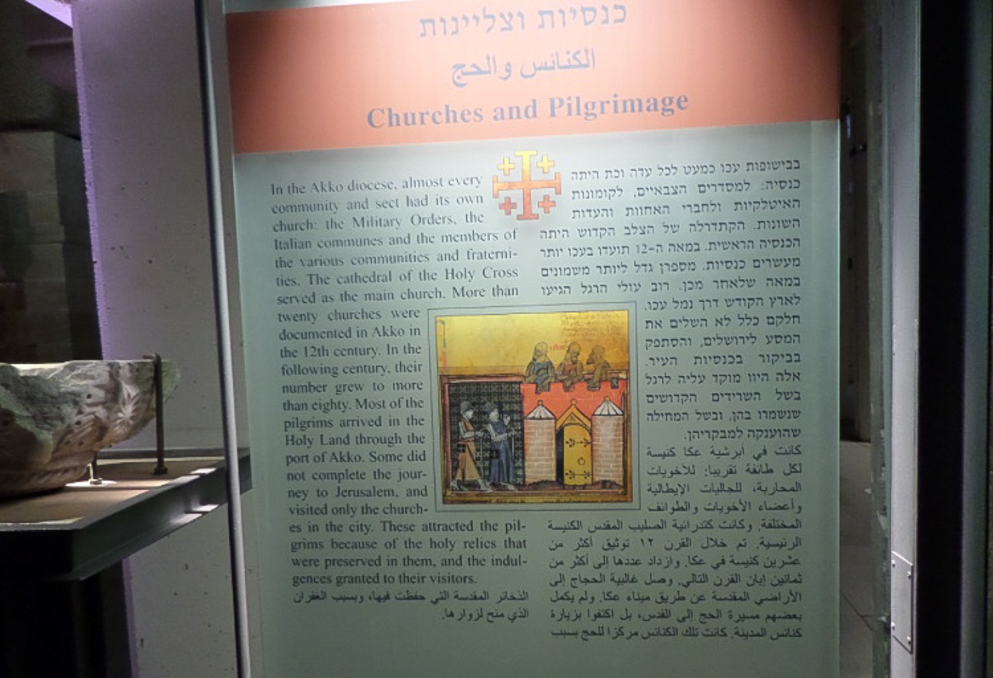A sign outlines the fact that the various religious ordersduring the Middle Ages in Acre each had their own churches. According to the sign there were over 80 churches in Akko in the 12th century. Furthermore, Akko was the port through which most pilgrims to the Holy Land arrived on their way to Jerusalem.