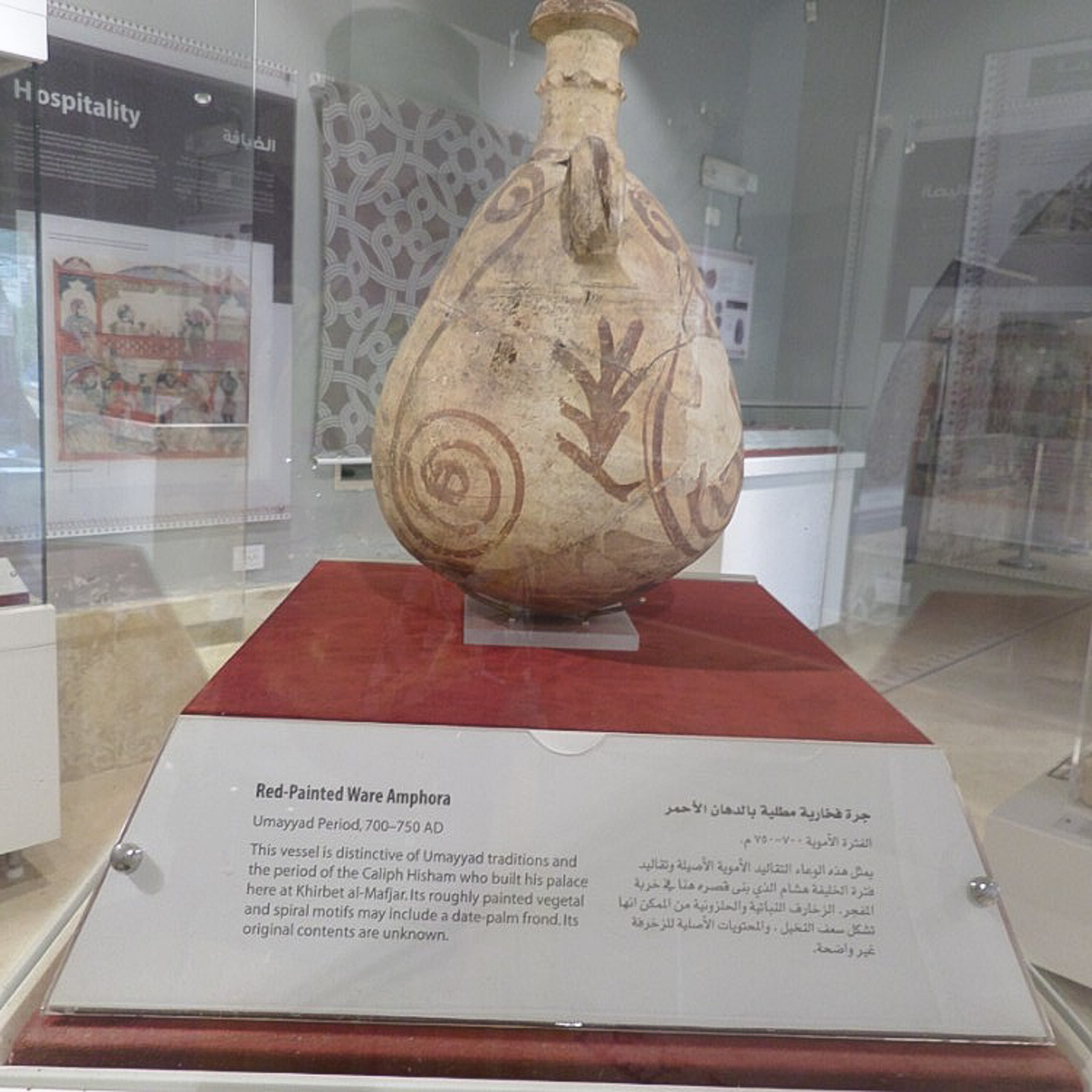An amphora decorated with red paint is on display in the small on-site museum.