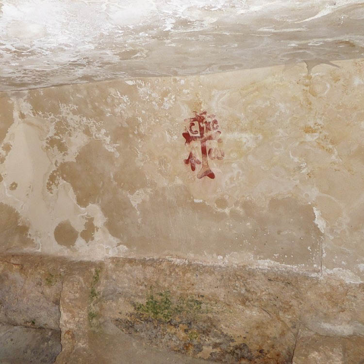 Wall of the Garden tomb which is marked with a graffito that was painted by Greek Christians (c. 500 CE) which is a symbol of Jesus Christ. This likely dates to when the site was related to a Christian monestary and the tomb used as a burial place for monks. This is a reproduction. The original is beneath a layer of preservation plaster. The letters on the cross: IC XC. (Jesus Christos/Jesus Messiah) and A W (Alpha and Omega -- the Beginning and the End).