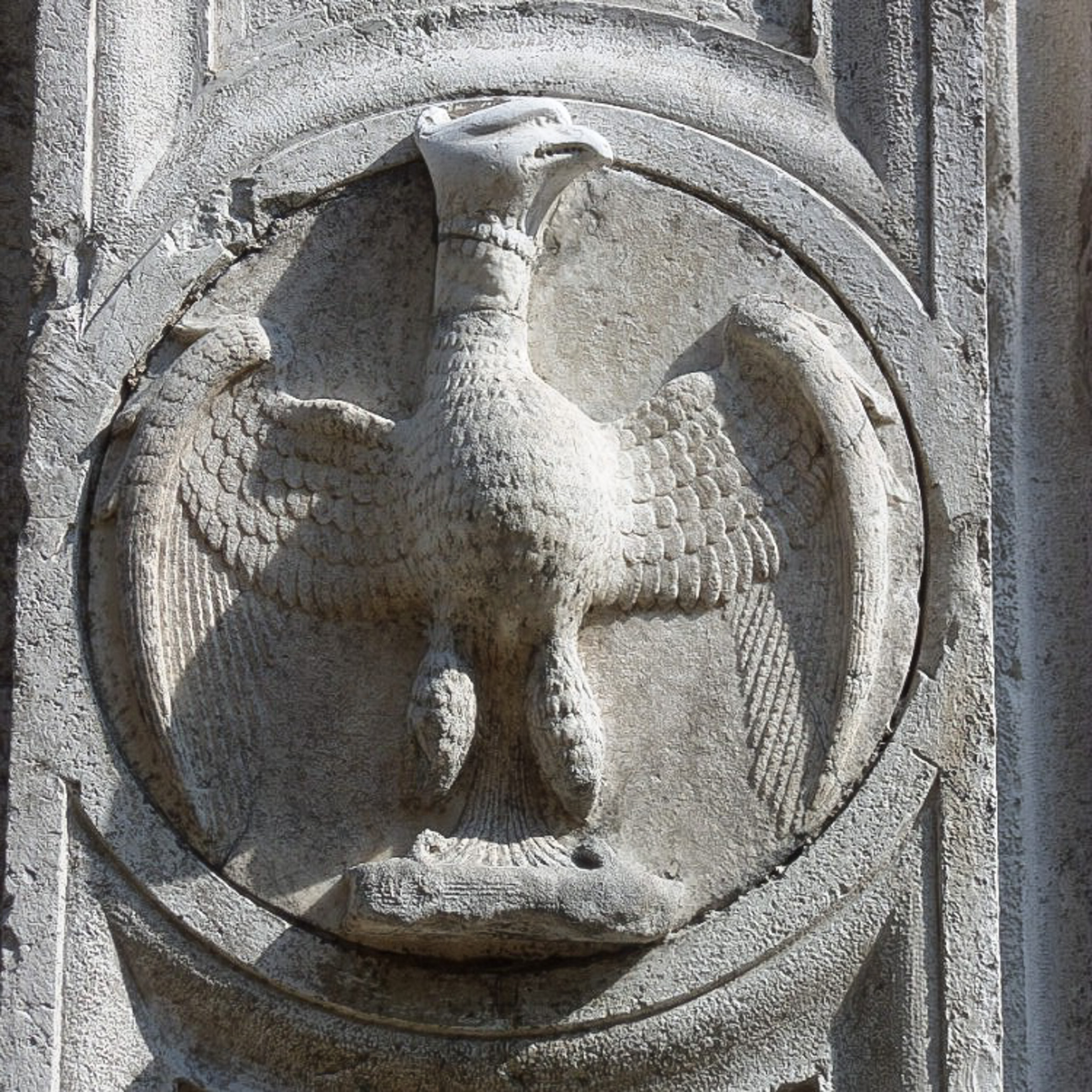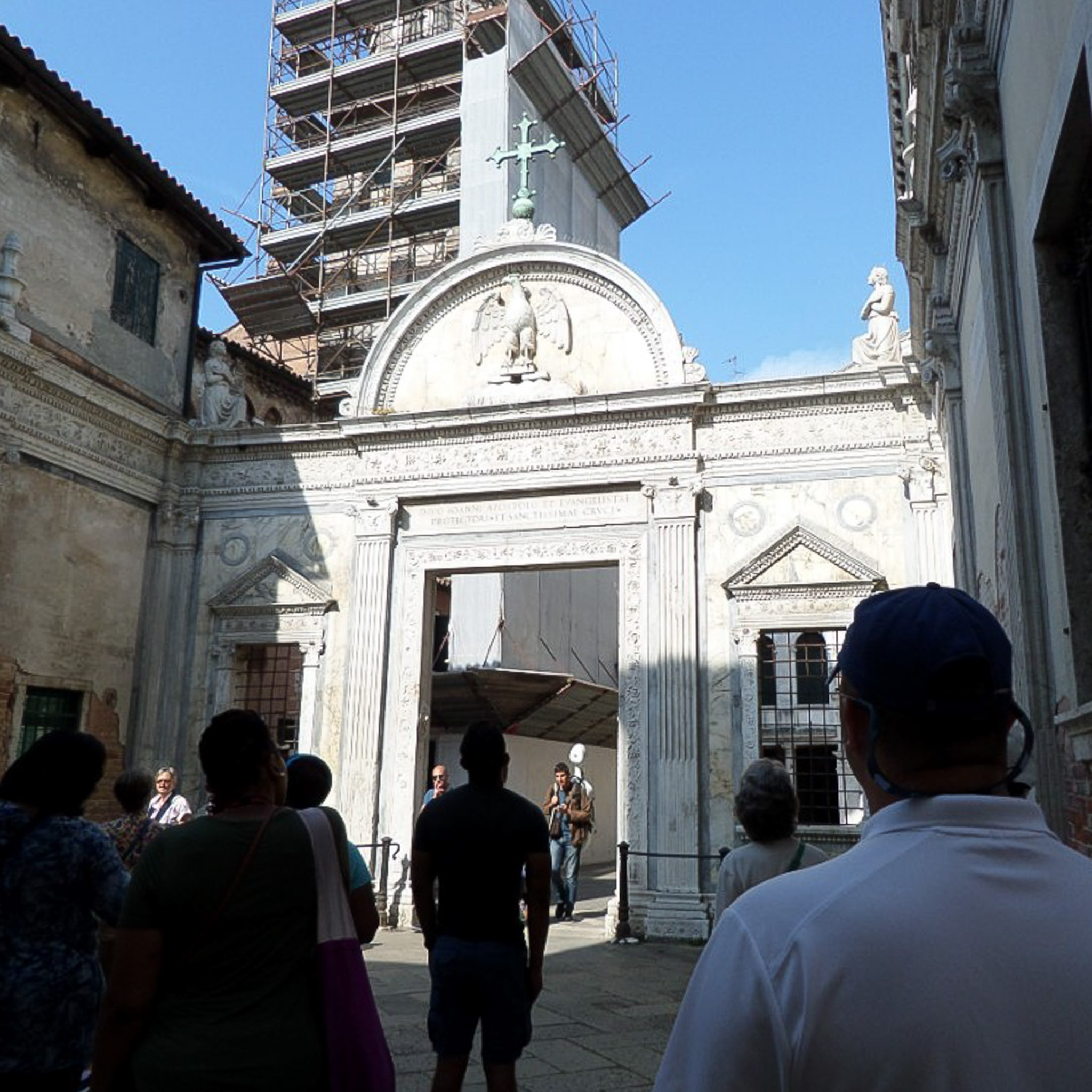Multiple photos are associated with this record. Please click the links to view all of the items in the series. One photo shows the portal to the San Giovanni Evangelista in Venice, Italy. Venice (in Italian: Venezia) is a city in northeastern Italy that is built on a group of 126 islands separated by open water and canals, linked through 472 bridges. The historical island city is home to only 51K people, but a very popular tourist destination with about 60K tourists per day. A UNESCO World Heritage Site, it is renowned for its beauty, architecture, and artwork. The San Polo district is in the heart of the main island of Venice, near the Rialto Bridge and the Rialto Market. It is the smallest district and one of the oldest in the city. San Giovanni Evangelista is a small square in San Polo containing the Scuola Grande of the same name, one of the oldest fraternities of men in Venice. The central arch of the portal is generally attributed to Pietro Lombardo, ca. 1481. The eagle sculpture is a symbol of St. John the Evangelist, which helped Renaissance Venetian men to know which scuola they were entering. An additional photo in this series also seems to be a relief sculpture of an eagle on the exterior of a building.