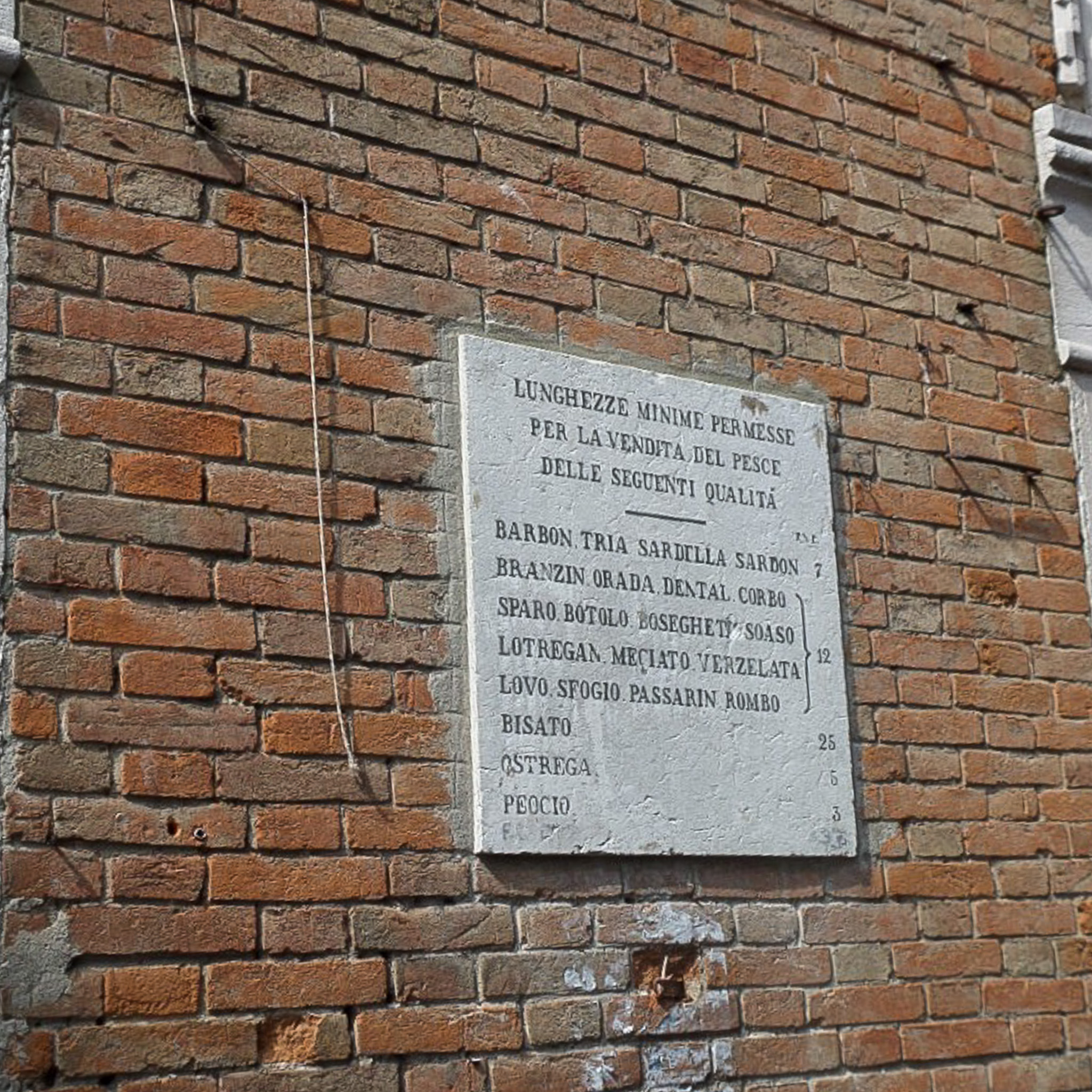 Multiple photos are associated with this record. Please click the links to view all of the items in the series. The photos are of the Rialto Market in Venice, Italy. Venice (in Italian: Venezia) is a city in northeastern Italy that is built on a group of 126 islands separated by open water and canals, linked through 472 bridges. The historical island city is home to only 51K people, but a very popular tourist destination with about 60K tourists per day. A UNESCO World Heritage Site, it is renowned for its beauty, architecture, and artwork. The San Polo district is in the heart of the main island of Venice, near the Rialto Bridge and the Rialto Market. It is the smallest district and one of the oldest in the city. The Mercato del Pesce al Minuto is a covered hall where fresh fish and seafood is sold. At the rest of the uncovered Rialto Market, fresh and dried fruit, vegetables, meat, and spices are sold. The exterior sign in Italian, roughly translated, provides "minimum lengths allowed for the sale of fish of the following qualities."