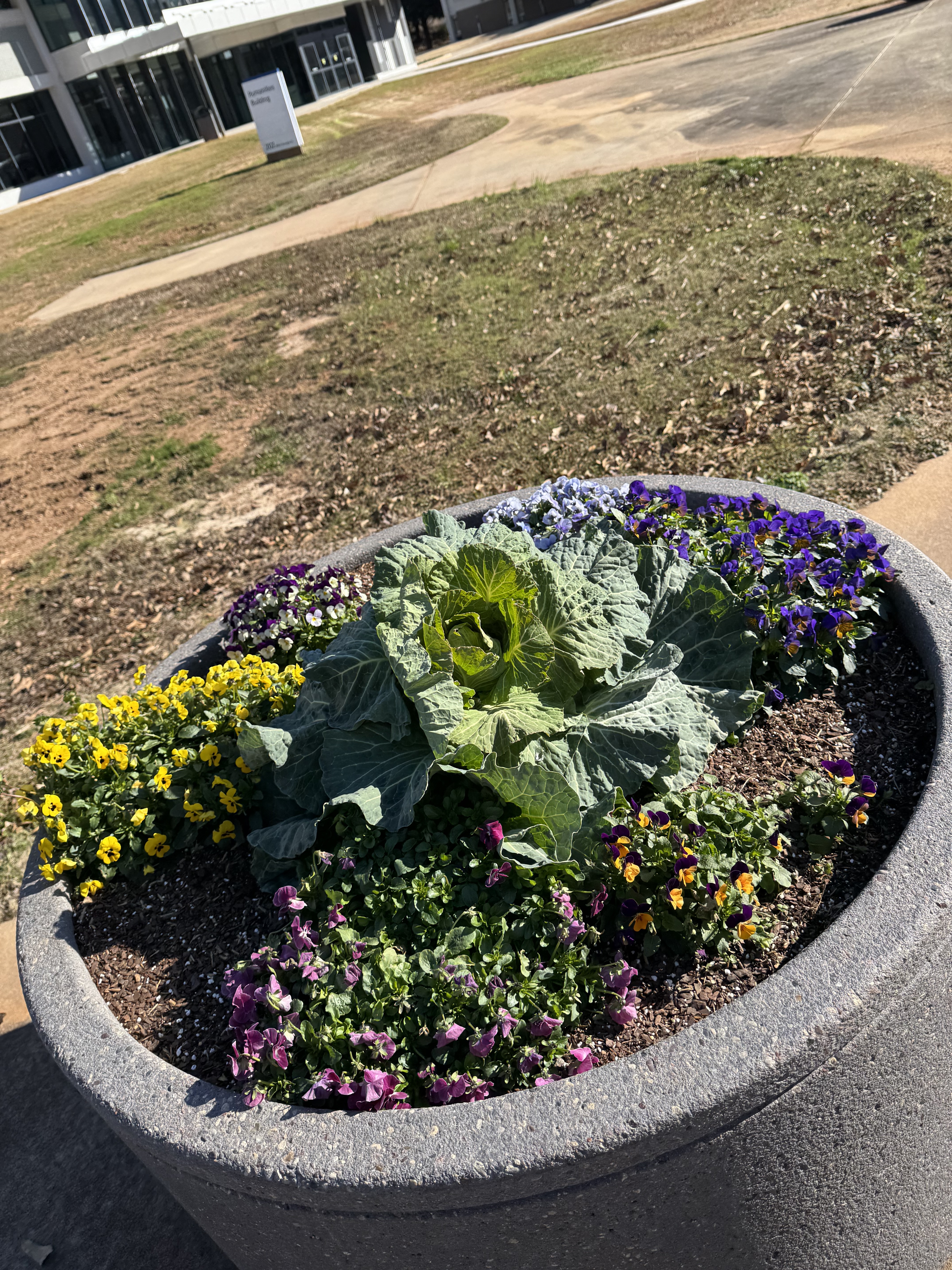The grounds crew at the University of West Georgia is attentive to every aspect of landscaping on the campus. Planters, like this round, cement planter, are scattered throughout campus and always feature seasonal blooms.