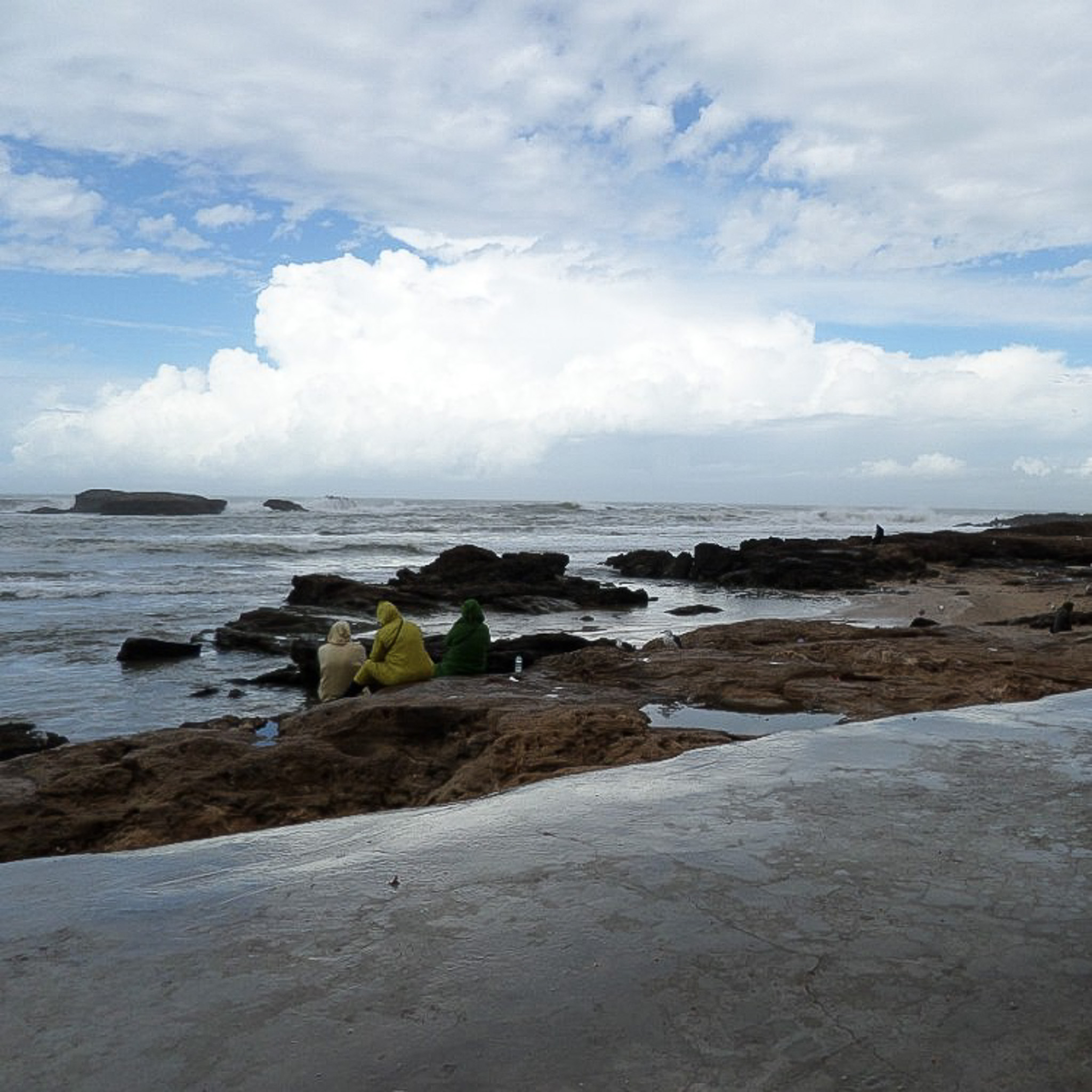 Three people sit on rocks and look out to the west from the coast of Essaouira to the bay and the Atlantic Ocean on a partly cloudy day. Cap Firaoune is the island on the left.
