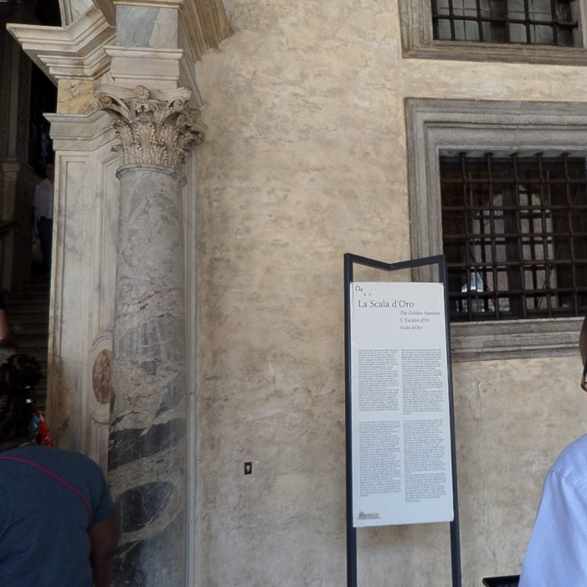 Multiple photos are associated with this record. Please click the links to view all of the items in the series. The photos show the Golden Staircase (in Italian: La Scala d'Oro) of the Doge's Palace (Palazzo Ducale), which is located in the San Marco district on the island of Venice, Italy. Venice (Venezia) is a city in northeastern Italy that is built on a group of 126 islands separated by open water and canals, linked through 472 bridges. The historical island city is home to only 51K people, but a very popular tourist destination with about 60K tourists per day. A UNESCO World Heritage Site, it is renowned for its beauty, architecture, and artwork. The landmark of St. Mark's Square is the basilica dedicated to Saint Mark the Evangelist and contains his relics. The church is sited on the eastern end of the Piazza of San Marco, the former center of the Republic of Venice, and is attached to the Doge's Palace. The Doge (chief magistrate) of Venice was the supreme authority of the Republic of Venice when this palace was built in 1340. The Golden Staircase continues the ascent begun by the Giants' Staircase (Scala dei Giganti) of the courtyard deeper into the heart of the Doge�s Palace. The Golden Staircase was the formal ceremonial entrance to the private apartments of the Doge and was used by visiting dignitaries. The lavishly decorated Golden Staircase in white stucco and 24-carat goldleaf was designed by Jacopo Sansovino in 1555 and was completed by Scarpagnino in 1559. The sculptor Alessandro Vittoria was responsible for the white and gold decoration; the ceiling frescoes are by the painter Giambattista Franco.