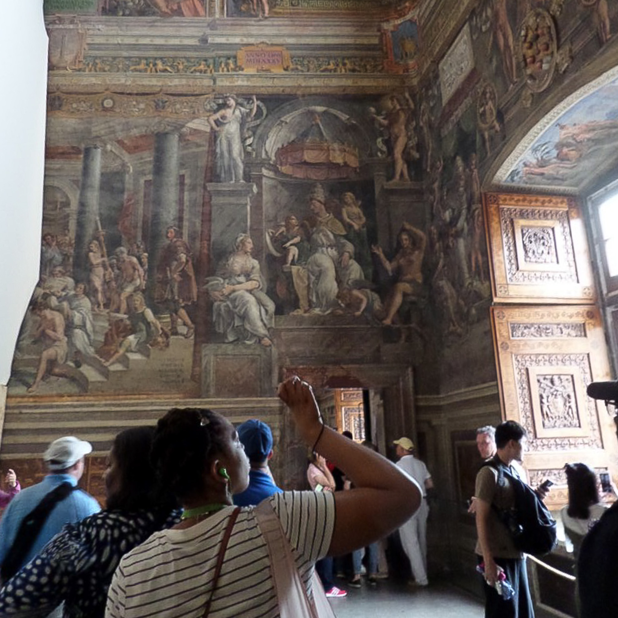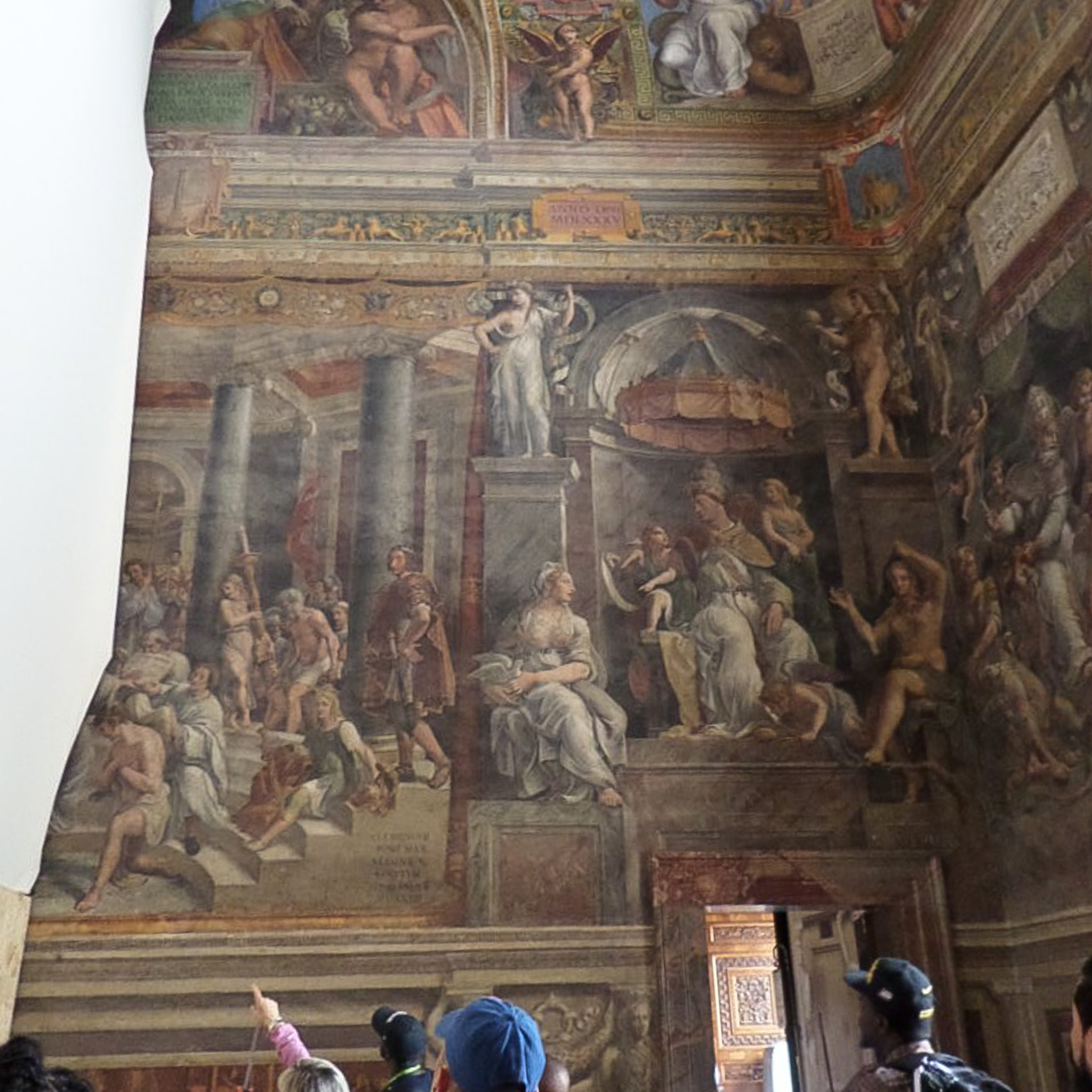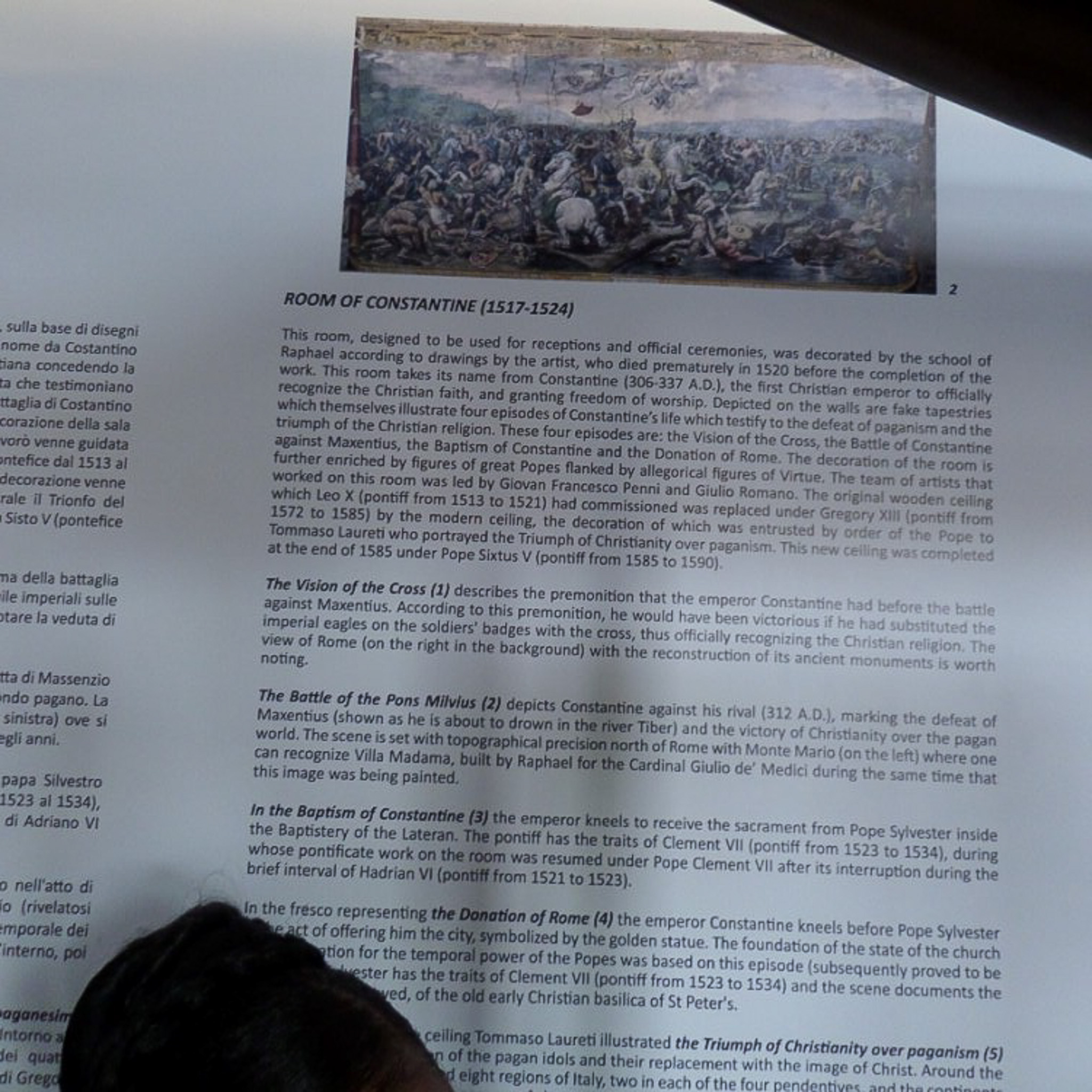 Multiple photos are associated with this record. Please click the links to view all of the items in the series. The photos were taken in the Hall of Constantine (Sala di Costantino) within the Raphael Rooms, which are part of the Vatican Museums. These are public museums that display about 20,000 of 70K works collected by the Catholic Church and the papacy throughout the centuries. The museums were founded by Pope Julius II in the early 16th century. Only the Louvre in France receives more annual visitors than the Vatican Museums. The museums consist of 24 galleries, with the Sistine Chapel being the last room visited. The Hall of Constantine is the largest of the Raphael Rooms. The fresco is called "The Baptism of Constantine" (1517-1524), which is the third of a sequence of four wall paintings in the room. It was painted by one of Raphael's pupils after designs by the master. Constantine promoted Christianity, but it is not actually known if he was baptized. Aside from the signage photo, these images are partial views of the painting; Constantine is the kneeling figure in the lower left, and the left half of the fresco is not photographed.