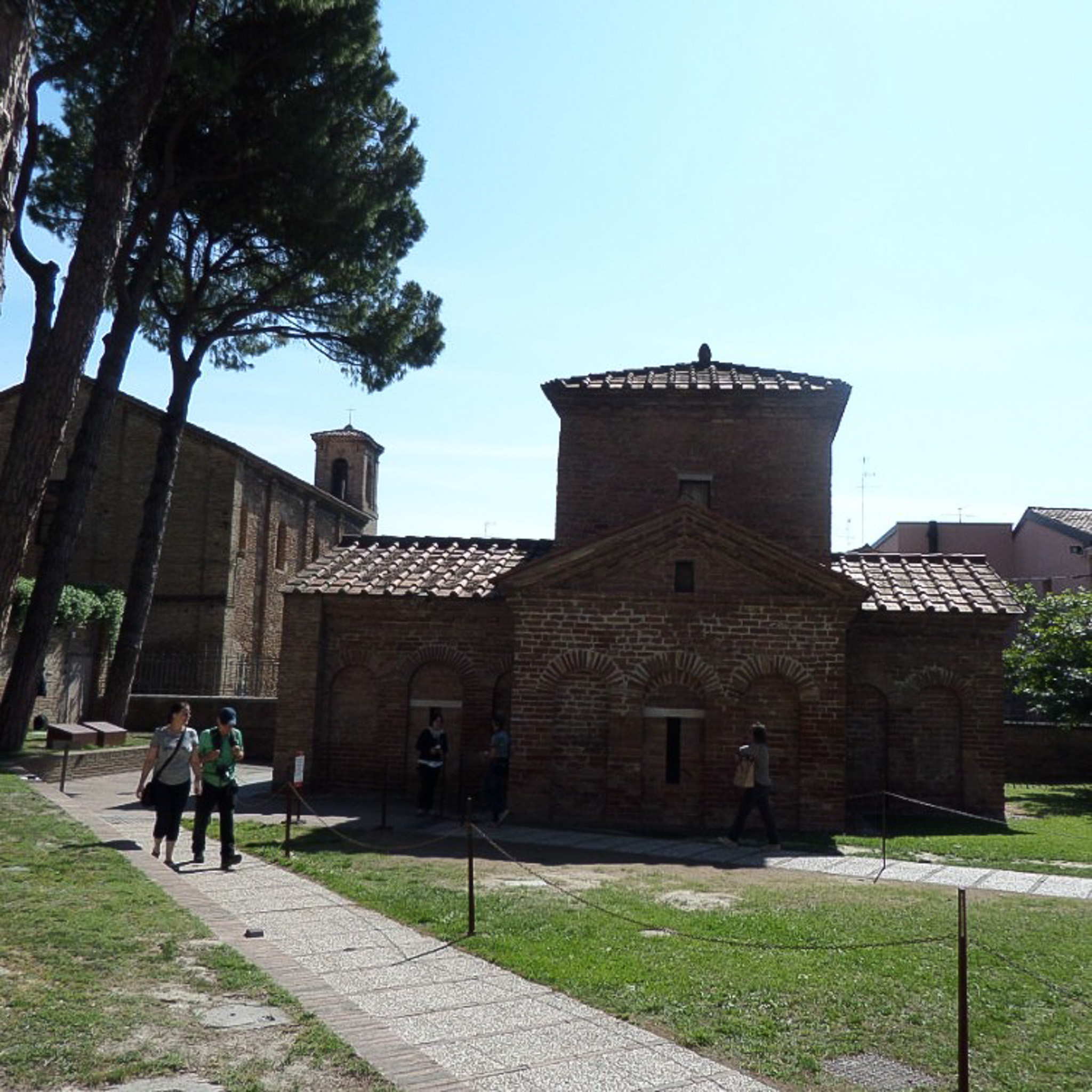 Walking away from the Mausoleo di Galla Placidia (Galla Placidia Mausoleum; Mausoleum of Galla Placidia) in Ravenna, Italy, with fewer tourists obscuring the view. The Mausoleum is the central building, with the Church of Santa Croce on the left. The Mausoleum was originally attached to the Church of Santa Croce.