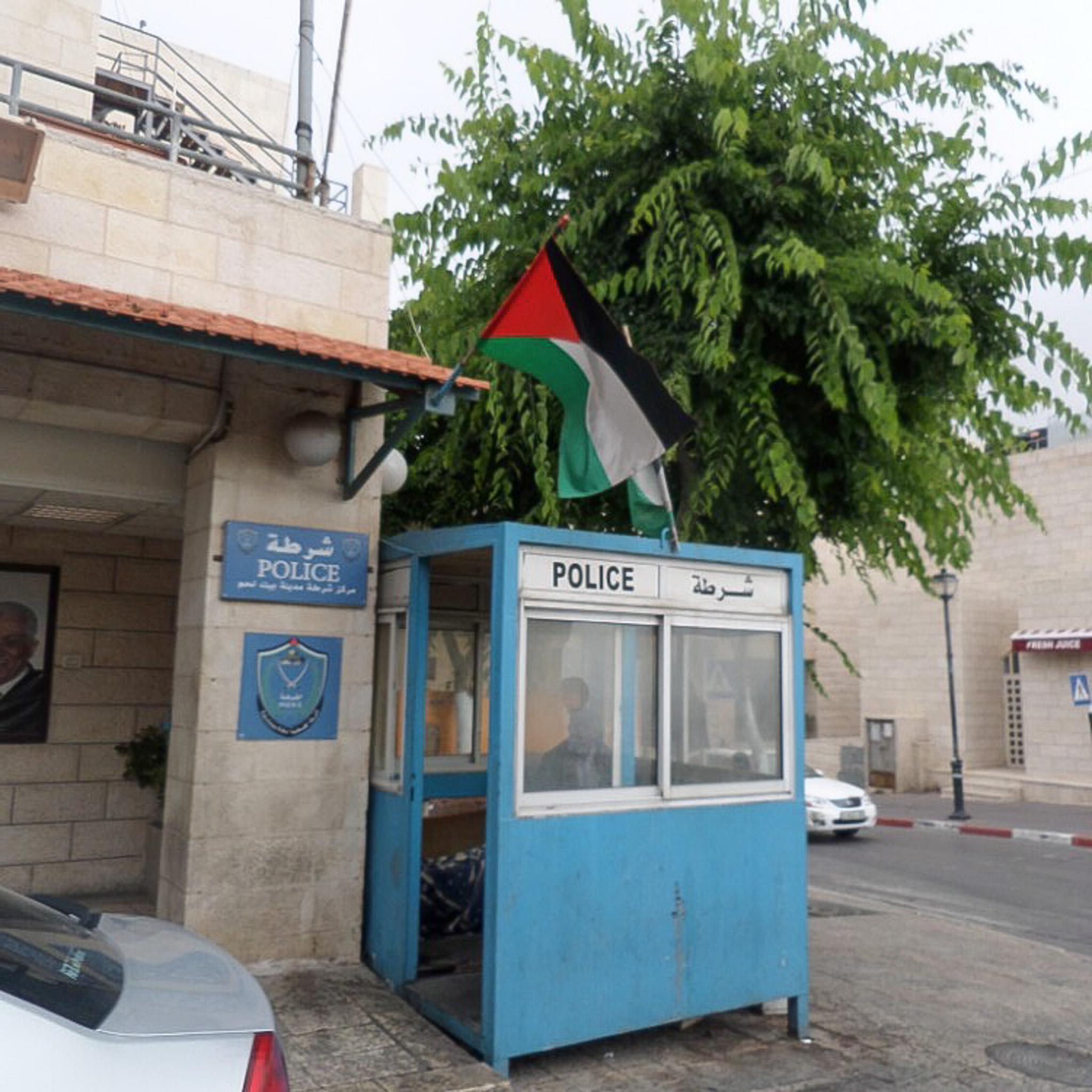 A police kiosk and Palestinian Flag near Manger Square in Bethlehem. Bethlehem is administered by the Palestinian National Authority.