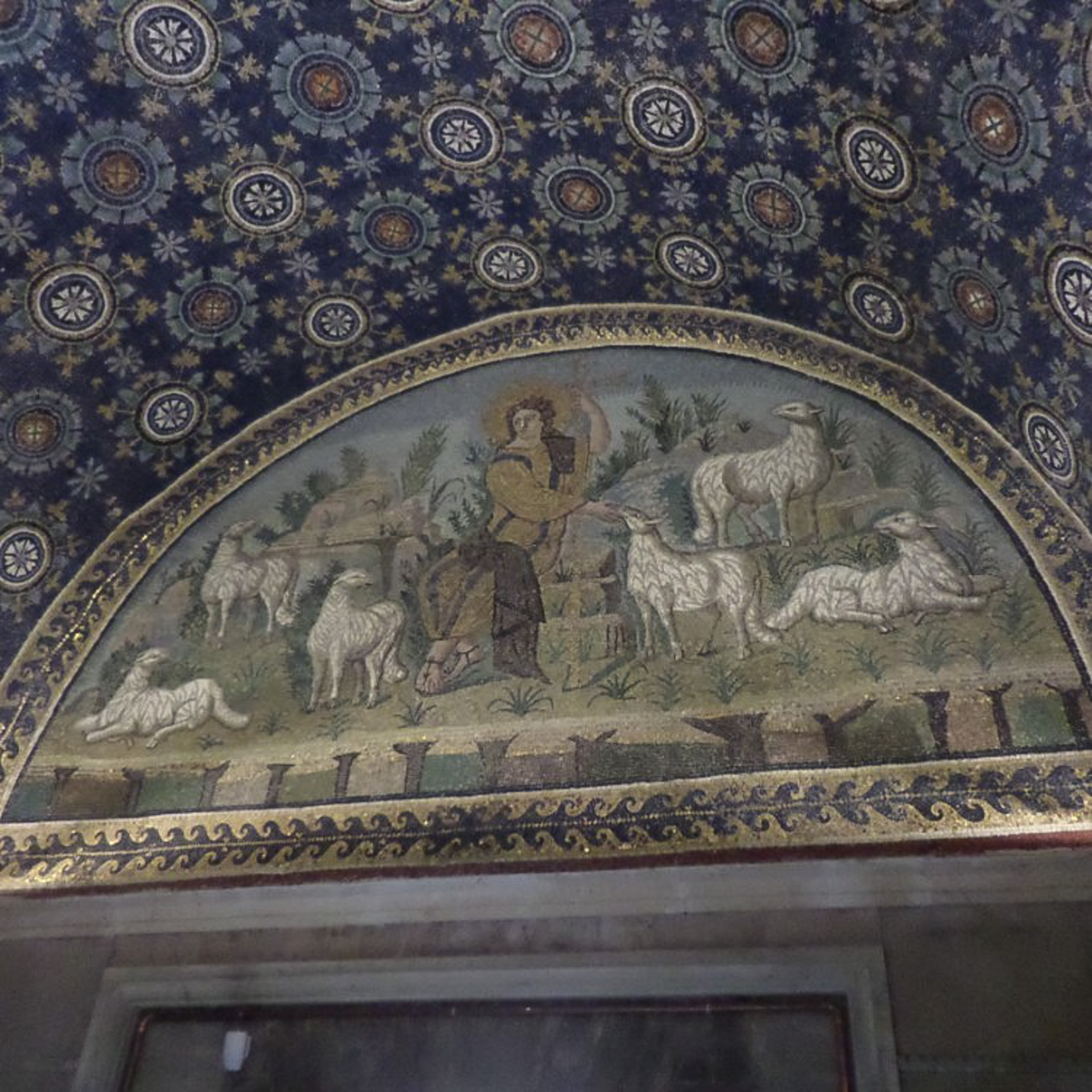 "The Good Shepherd" lunette mosaic directly above the entrance to the Mausoleo di Galla Placidia (Galla Placidia Mausoleum; Mausoleum of Galla Placidia) in Ravenna, Italy. The Good Shepherd is a metaphor for Yahweh (God) in the Old Testament, but represents Jesus Christ in the New Testament (John 10:1�21), who lays down his life for his sheep. The placement of this mosaic over the entrance alludes to the concept that only through Christ can we reach eternal peace. The mosaic depicts the Shepherd with a calm, beardless face, wearing a golden tunic and purple mantle, with a large cross and a golden halo. The figure is posed on rocks among six sheep. Above the Good Shepherd is the mosaic decoration of a barrel vault: moonflowers in a deep blue sky.
