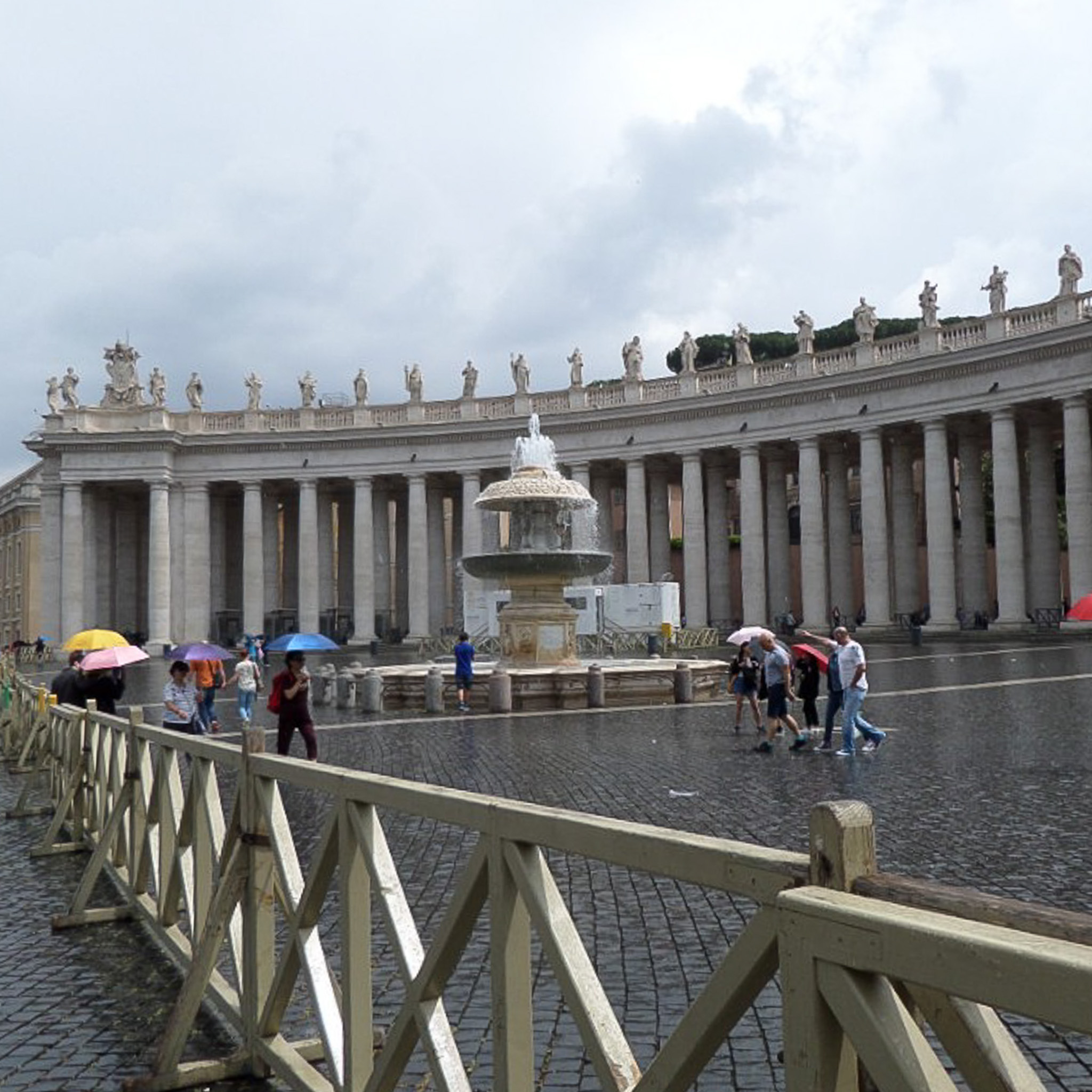 St. Peter's Basilica was originally designed by architect Bramante as a central plan at the behest of Julius II to be the largest, most magnificent church in Christendom when it was rebuilt in the early 16th century. Raphael and Michelangelo and later architects such as Maderno and Bernini designed and decorated the elongated nave to create a basilica which would hold large numbers of people and focus attention on the altar; therefore, it incorporates both Italian High Renaissance and Baroque sensibilities. It was begun in 1506 and completed in 1626. According to the Catholic Church, the very holy basilica is the burial site of Saint Peter. The photo shows a small part of St. Peter's Square with Colonnades, which is a large plaza directly in front of the basilica. It was designed by Gian Lorenzo Bernini from 1656 to 1672. The colossal Doric colonnades, four columns deep, provide a framework for the trapezoidal entrance to the basilica and the massive elliptical plaza in front of it. Statues of 140 saints top the colonnades. The center of the photo features one of the two nearly identical fountains in the plaza. The north fountain was designed by Carlo Maderno and the south fountain by Bernini.