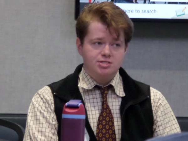 Student panelist Jackson Rimmer answers questions at the University of West Georgia 2024 Humanities Undergraduate Research Conference. Rimmer is wearing a dark vest, checked shirt, and burgundy tie. He was part of the "Nation and Culture" session. There are multiple photos with this record. Please click the links to open the individual photos.