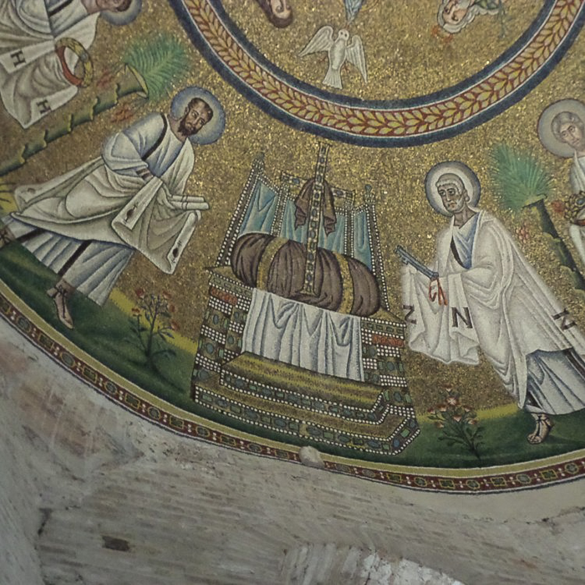 In the lower register of the ceiling's mosaic of the Battistero degli Ariani (Arian Baptistery; Arian Baptistry), below and upside down from the central medallion, Saints Paul and Peter are depicted on either side of a jewelled cross with a garment draped over it, positioned on a throne. This is known as the hetoimasia and is probably a reference to Christ's second coming. Paul (on the left) holds a scroll, whereas Peter (on the right) holds keys. A portion of Andreas, the apostle behind Peter, is visible in the photo.