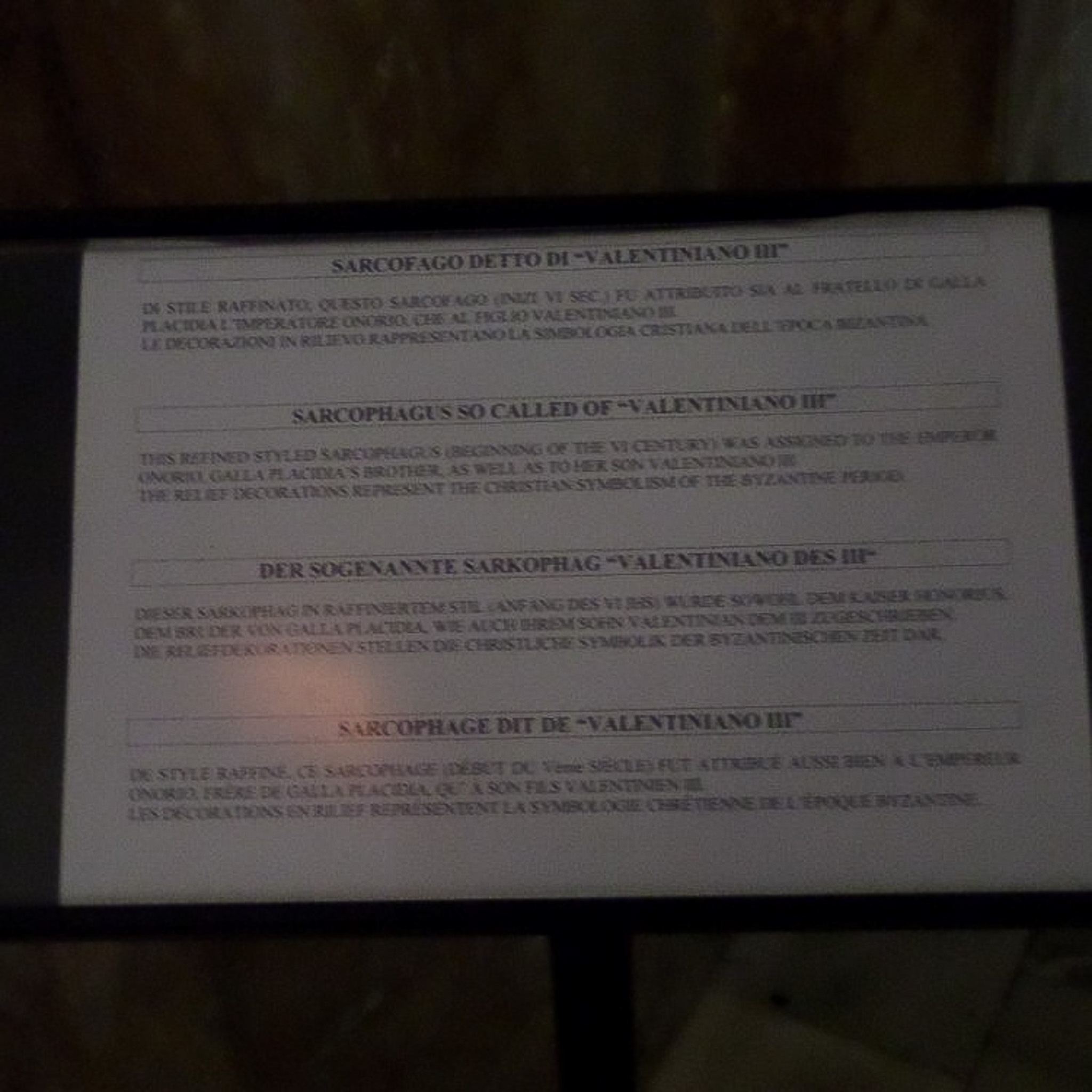 The signage, in four languages, about the supposed sarcophagus of Valentinian the Third at the Mausoleo di Galla Placidia (Galla Placidia Mausoleum; Mausoleum of Galla Placidia) in Ravenna, Italy. Each of the three sarcophagi in the Mausoleum are empty.