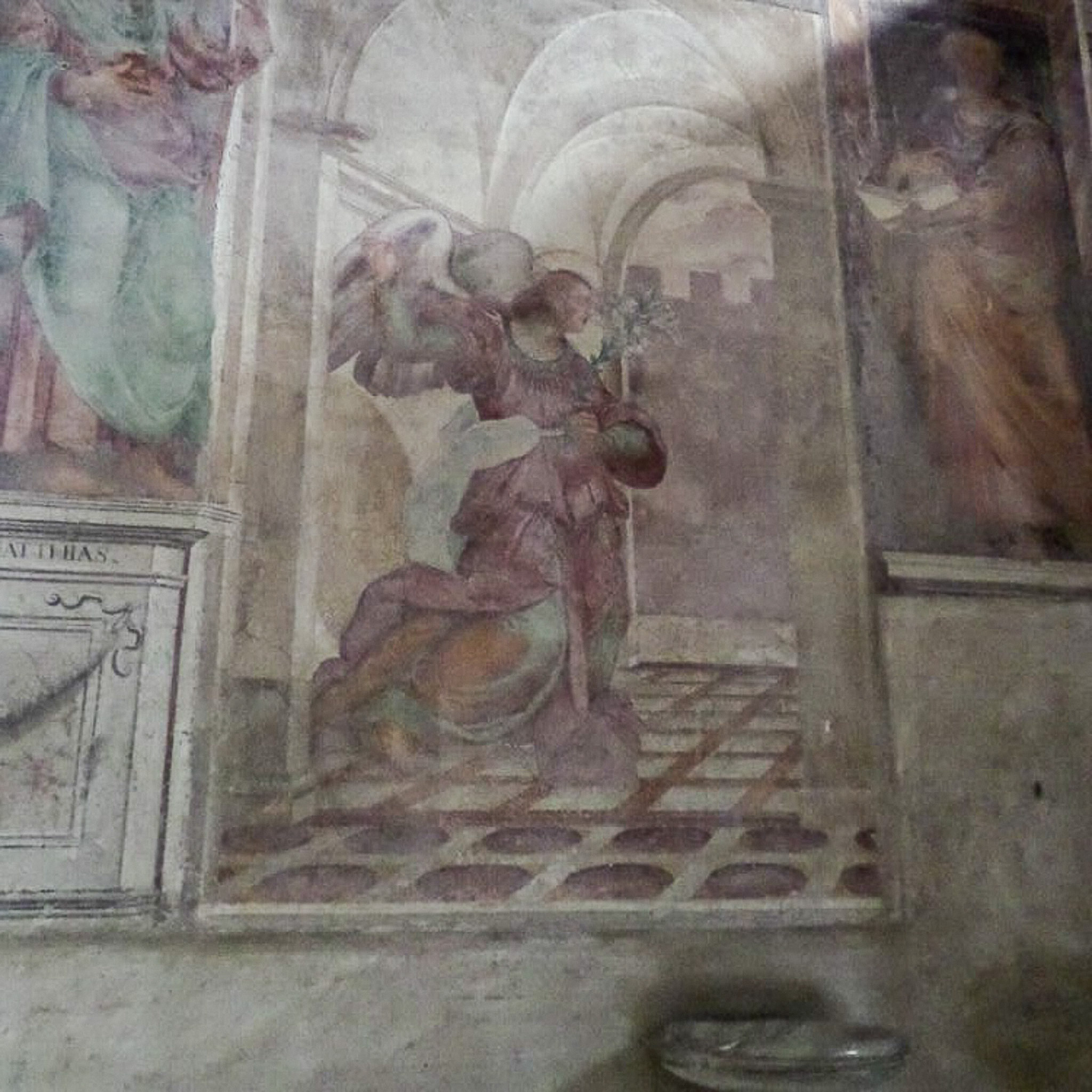 The Basilica of Saint Praxedes (in Italian: Basilica di Santa Prassede, commonly known as Santa Prassede) is a Catholic basilica located in the Rione Esquilino (or district of Esquiline). Esquiline is the name of a Roman hill, one of seven on which the ancient city was built. The church was rebuilt by Pope Pasquale I in 822 CE and was restored multiple times since then. It was built principally as a resting place for the relics of Roman martyrs and was dedicated to the second-century Saint Praxedes, who was the daughter of a Roman senator. Along with her sister, Praxedes provided comfort and care to Christians persecuted in the Roman Empire. The sisters were murdered for burying early Christian martyrs, which defied Roman law. The church is known for being the most important example of early Christian Byzantine art in Rome because of the mosaics decorating its apse and side chapels. The photograph shows 17th century frescoes within the central nave (of three). The frescoes feature the Apostles and the Passion of Christ. Note the three dimensionality of the frescoes; the angel seems to be moving within a classic architectural space, a perspective which is characteristic of High Italian Renaissance paintings.