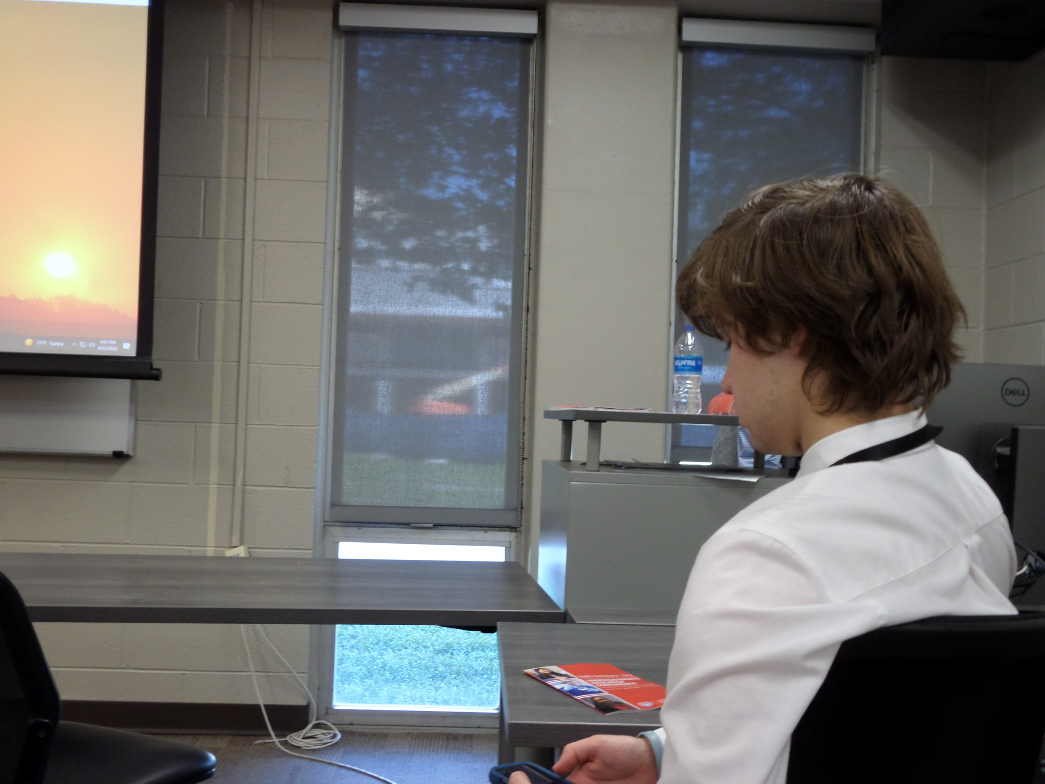 Joshua McCollum, moderator for the panel presentation "Microbial Life on Earth and Mars," checks the timer on his phone to keep the presenters within their allotted time of twenty minutes per presentation. The session was held in Pafford Hall during UWG's 2024 Scholars' Day Undergraduate Research Conference.