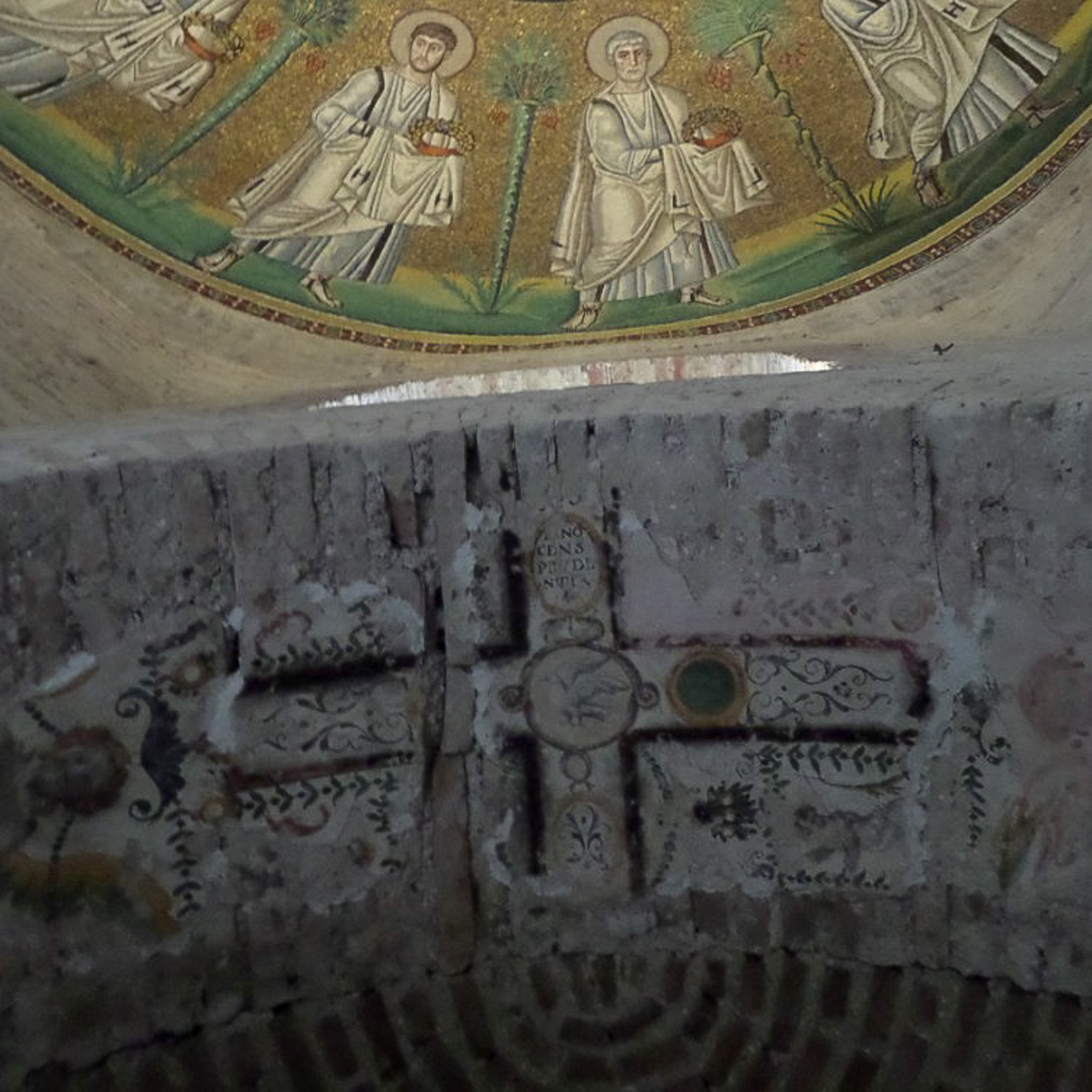 Much of the interior decoration of the Battistero degli Ariani (Arian Baptistery; Arian Baptistry) has been lost over the centuries (aside from the ceiling mosaic), but this fragment of art remains on the wall. This photo shows an extension of the previous photo, with a portion of the domed ceiling's mosaic decoration. The mosaic depicts two full representations of the twelve apostles, and two partial portions.