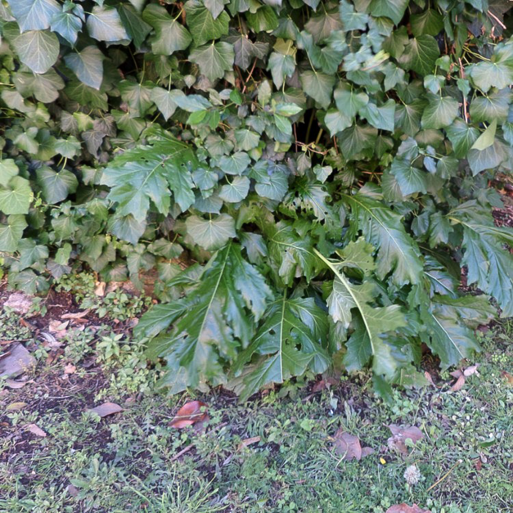 Many plants within the Abbey of the Three Fountains complex (Rome, Italy) have symbolic meanings, such as laurel and palm trees. Species of ivy (top) and acanthus (bottom) are pictured. Acanthus flourishes in warm climates. Acanthus leaves are a common motif in Roman art and often feature in the capitals of Corinthian columns.